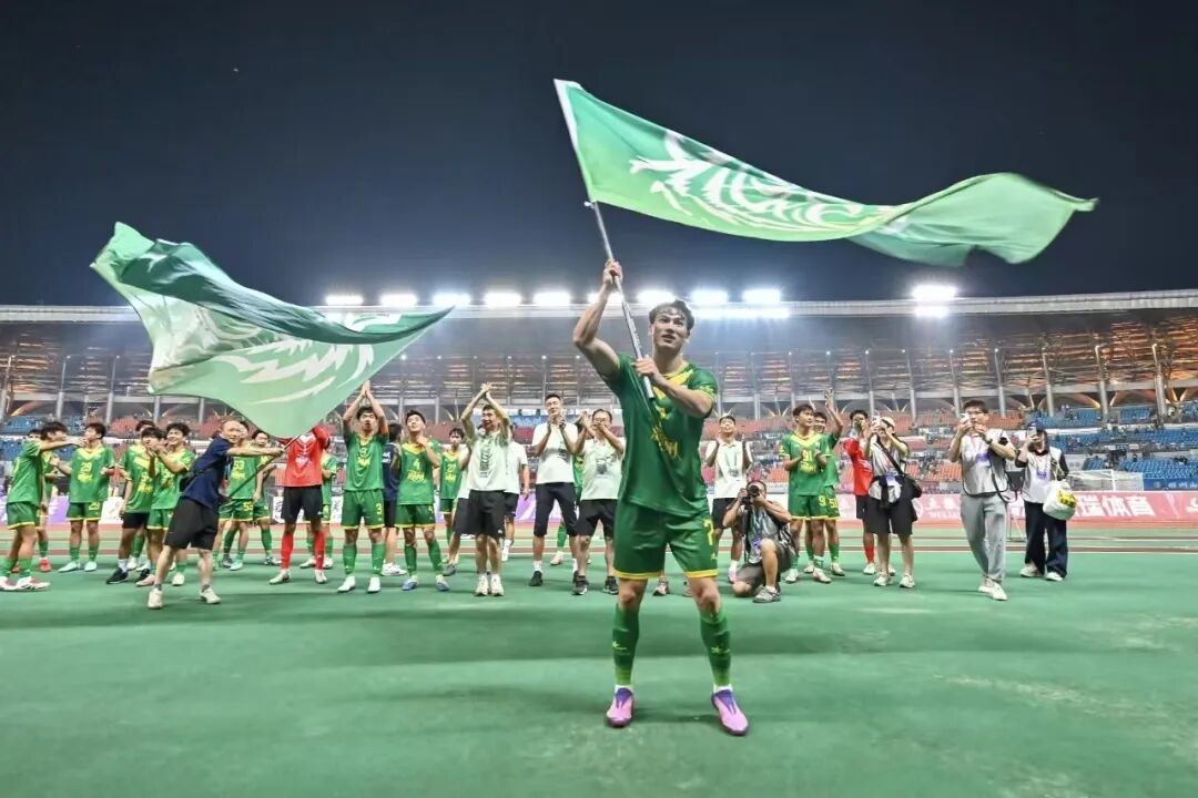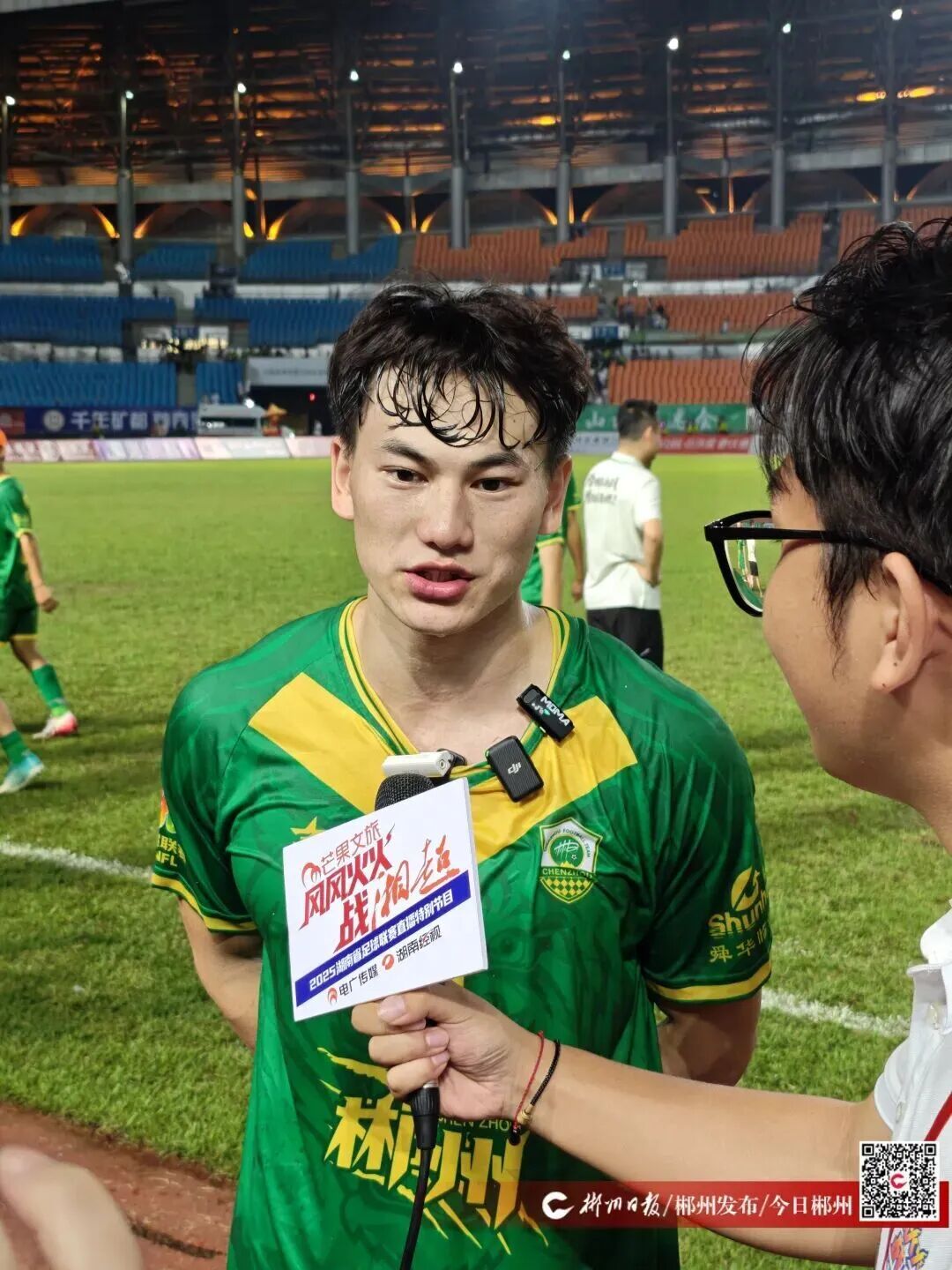 10月11日,“湘超”第五轮常规赛郴州主场对阵张家界队,湖南师范大学2025届毕业生王博首次征战“湘超”联赛,在下半场比赛中相继攻入3球,助力郴州队以3:1的大比分战胜张家界队。