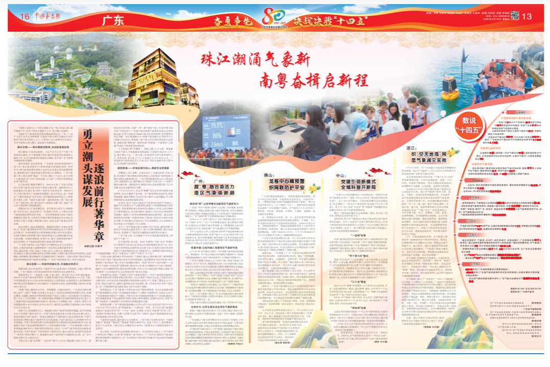 “弄潮儿向涛头立,手把红旗旗不湿。”珠江奔涌入海,潮声激荡千年,滋养了岭南大地敢为人先、勇立潮头的精神。当新时代气象高质量发展的潮流澎湃而至,广东——这片习近平总书记深情寄望“在推进中国式现代化建设中走在前列”的改革开放热土之上,气象部门正以奋楫争先的姿态,书写气象事业勇立潮头、逐浪前行的新篇章。珠江潮涌,方向决定航程。习近平总书记关于气象工作重要指示精神、关于粤港澳大湾区建设的重要讲话重要指示精神、对广东系列重要讲话重要指示精神,是引领广东气象乘风破浪的根本遵循。善弈者谋势,善治者谋局。广东省委、省政府高度重视气象工作,高位推进落实《气象高质量发展纲要(2022—2035 年)》,将气象高质量发展纳入经济社会发展全局同部署同推进,高标准完成气象高质量发展首批试点省建设。广东气象部门深入落实省委“锚定一个目标,激活三大动力,奋力实现十大新突破”的“1310”具体部署,以“638”工作指引统筹推进全省气象布局。合力似奔雷,激荡弄潮伟力。2021年以来,广东省人民政府与中国气象局全面完成《气象防灾减灾第一道防线先行示范省建设合作备忘录(2021—2025年)》各项任务。2025年5月,中国气象局与广东省政府签署新一轮合作协议,进一步锚定“气象科技强省”宏伟目标,共同擘画数值预报及人工智能技术强芯工程、气象防灾减灾第一道防线筑强工程、“海上新广东”气象护航工程、数字经济气象服务支撑工程、美丽广东生态气象保障工程战略蓝图。贯通如江河,汇聚弄潮洪流。省气象局主动作为,积极推进“市市有试点、县县有抓手”,形成部门协同、上下联动共推气象高质量发展的良好局面。广东发挥粤港澳大湾区气象发展辐射引领作用,支持和引导粤东粤西两翼地区和北部生态发展区气象工作融入粤港澳大湾区,促进全省气象事业协同发展。法治若磐石,锚定弄潮根基。潮涌需有堤岸,发展必有规矩。《广东省气候资源保护和开发利用条例》制定出台引领绿色发展;《广东省防御雷电灾害管理规定》修订筑牢安全堤坝;《河源市暴雨灾害预警与响应条例》等地方立法聚焦解决本地实际问题。24部法规规章、90部行业、地方、团体标准织就严密法治网络,为气象高质量发展行稳致远保驾护航。“广东省气象局以习近平新时代中国特色社会主义思想为指导,以服务国家重大战略和服务广东经济社会高质量发展为导向,激活改革、开放、创新三大核心动力,以数字化、智能化转型为路径,以健全法规标准体系为保障,构建‘以智慧气象为特征的科技领先、监测精密、预报精准、服务精细和人民满意的现代气象体系’,实现从传统气象业务向全链条多领域高价值气象服务的跨越。”广东省气象局党组书记、局长庄旭东说。弄潮深海,惟以科技铸剑,方能斩开风云迷雾;惟以开放扬帆,方能汇聚四海智慧。广东气象部门在科技创新和改革开放的深水区奋楫争先。南粤苍穹之下,一张地面、空基、天基、海洋一体化的“风云天网”越织越密。5500余个区域气象站星罗棋布,全省降水要素空间分辨率提高至4.7公里,气温、风等要素提升至6.6公里;形成S波段雷达大范围警戒、X波段雷达小范围精细探测的雷达协同观测体系;率先建成北斗导航探空系统;远海观测能力延伸至岸基300公里左右。“智算”奔流,解码风云天机。预报精准,方能驭浪而行。广东成功突破关键核心技术“卡脖子”难题,初步建立完全自主可控的区域数值预报模式体系;构建全覆盖、无缝隙、精细化四维网格预报技术体系,实现0—60天最高时空分辨率达到1小时、1公里的海陆一体、短临短期延伸期融合的智能网格预报业务;基于人工智能的强对流监测预警识别技术,强对流天气预警能力进一步提升,雷雨大风预警提前量从44分钟延长至70分钟左右,暴雨红色预警信号提前量从20分钟延长至30分钟左右。世界气象中心(北京)粤港澳大湾区分中心 广东省气象局供图创新平台,熔铸硬核实力。粤港澳大湾区气象研究院昂然崛起,成为华南地区首个国家级气象科创平台。中国气象局龙卷风重点开放实验室在佛山成立,省部共建的中国气象局/广东省区域数值天气预报重点实验室持续发展,中国气象局南海(博贺)海洋气象野外科学试验基地、中国气象局龙门云物理野外科学试验基地、中国气象局雷电野外试验基地等成为国家级试验基地的砥柱中流,粤港澳大湾区气象监测预警预报中心(深圳创新研究院)、广州市粤港澳大湾区气象智能装备研究中心等新型研发机构活力迸发。“1+N”气象科技协同创新体系基本成型,中国气象局广州热带海洋气象研究所、重点实验室、新型研发机构等“一核多柱”格局不断扩大,粤港澳大湾区气象科技平台集群效应凸显,为广东气象能力提升注入前沿动力。开放合作汇通“世界潮”。在世界气象中心(北京)粤港澳大湾区分中心,国际培训火热开班,共建“一带一路”国家气象工作者齐聚羊城共享“中国经验”;广东超大城市智慧气象服务经验从这里扬帆出海,世界气象组织(WMO)秘书长席列斯特·绍罗盛赞其突出贡献。深化粤港澳合作,珠澳气象创新与应用研究中心(珠海)应运而生,粤港澳三地气象业务协同发展机制日益成熟,基础设施“硬联通”、规则机制“软联通”、气象服务“心联通”的湾区气象新格局加速形成