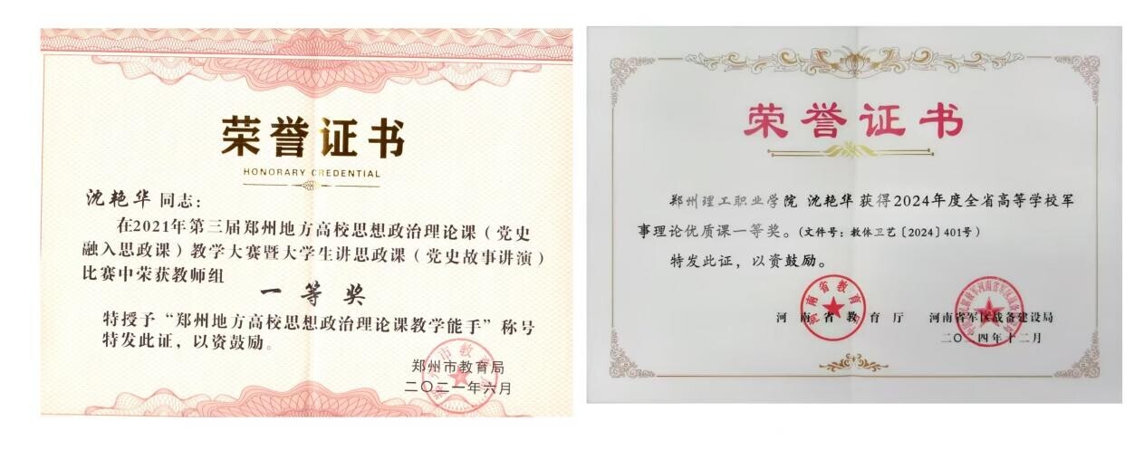 2021年她参加第三届郑州市地方高校思想政治理论课教学能力大赛获得一等奖并被授予“郑州地方高校思想政治理论课教学能手”荣誉称号;她主讲的《军事理论》获评校级“优质课程”,2024年备战省级军事理论优质课比赛期间,她反复打磨教学设计至凌晨,与学生反复沟通,不放过任何细节,克服视频录制技术支持不足的困难,最终凭借生动的国防案例、沉浸式教学环节斩获河南省高等学校军事理论优质课一等奖。