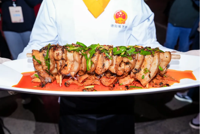 “广汉大刀回锅肉”是来自德阳市选手的当家菜。他介绍说,这是承载着60万+份食客认可的“川味名片”,精心挑选了四川大山粮食喂养猪二刀肉,出锅的回锅肉油亮红润,蒜苗翠绿点缀,香气瞬间弥漫开来。虽大块,入口时,肥肉肥而不腻、入口即化,瘦肉嫩而不绵、嚼有肉香,酱汁裹着每一丝肉纤维,咸香中带着微甜,肉质化渣、配上香酥锅盔同时入口,口感堪称一绝。