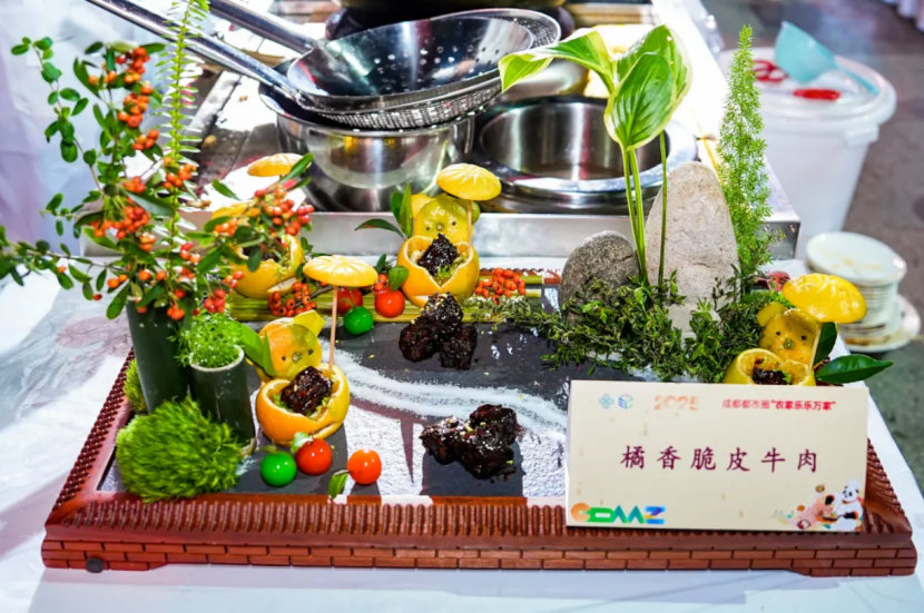 在最后一轮创意菜比拼中,选手们充分发挥想象力,将川菜的传统技艺与现代创意相结合,创造出一道道令人惊叹的菜品。来自成都市的选手带来了一道“橘香脆皮牛肉”抓住了专业评委和现场观众的心。选手介绍说,这是以蒲江县西来镇的山水灵秀为纸、土地风物为墨,绘就一幅融合乡土情怀与烹饪智慧的味觉画卷。“原材料取自蒲江盛夏枝头的鲜甜夏橙,饱满莹润、香气清冽。牛肉的脆皮焦香与橙香在高温中碰撞,形成令人惊艳的味觉冲击。”