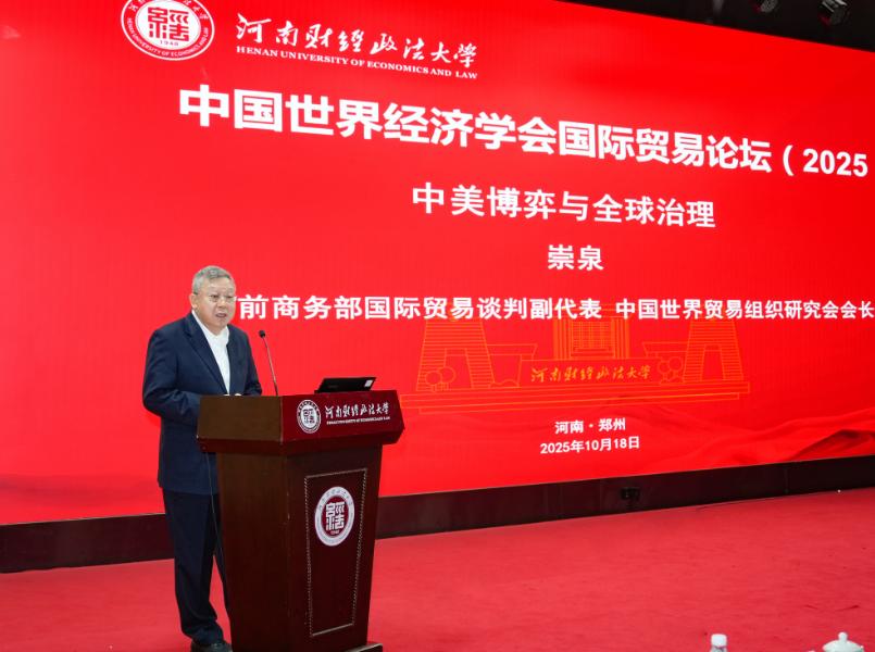 10月18日,由中国世界经济学会主办、河南财经政法大学经济学部承办的“中国世界经济学会国际贸易论坛(2025)”在郑举办。商务部前国际贸易谈判副代表、中国世界贸易组织研究会会长崇泉,中国社会科学院国家全球战略智库秘书长东艳,河南财经政法大学党委书记、校长司林胜,党委副书记赵楠,副校长叶光出席论坛开幕式。来自全国50余所高校、科研院所、学术期刊的专家学者和师生代表参会。