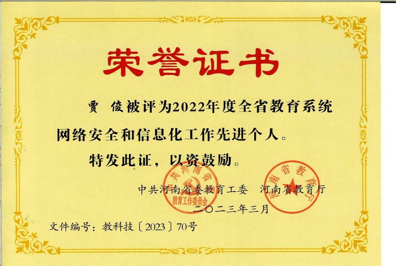 贾俊的工作业绩不仅校内屡获肯定,多次被评为“先进教育工作者”与“优秀共产党员”,而且获得了省级认可,2020年与2022年两度获评“全省教育系统网络安全和信息化工作先进个人”。这份从技术深耕到管理创新的跨越,既见证了他十二年的成长轨迹,也坚定了他未来前行的方向。他将一如既往,以技术为笔,以管理为墨,继续在他热爱的这片理工热土上,描绘更加智慧、安全、便捷的数字新蓝图。