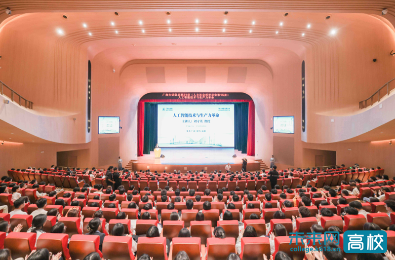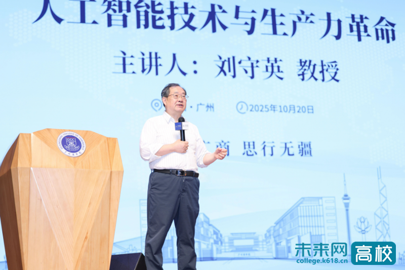10月20日下午,中国人民大学经济学院教授、博士生导师,全国数字经济专业学位研究生教育指导委员会秘书长刘守英教授做客广州商学院“广商大讲堂”总第21讲(人文社会科学讲堂第15讲),共同探讨人工智能技术与生产力革命的前沿话题与深刻影响。广州商学院董事长郭小聪、学校领导、各二级学院师生代表等近千人在求真文化中心参加活动。