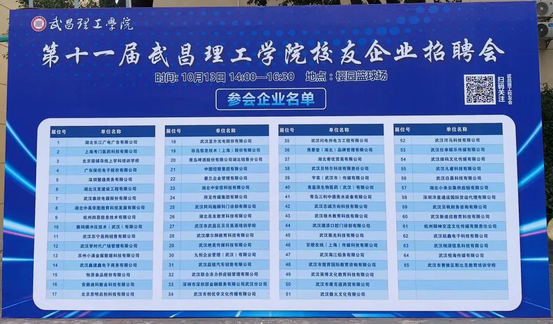 本次招聘会以“校友聚力,职引未来”为主题,吸引了65家校友企业积极参与,涵盖信息技术、文化传媒、教育培训、电子制造、金融服务等多个领域。从湖北长江广电广告有限公司、上海考门医药科技有限公司等行业知名企业,到武汉昱升光电股份有限公司、珍岛信息技术(上海)股份有限公司等新兴领域代表,再到牧原食品股份有限公司、青岛啤酒股份有限公司湖北销售分公司等民生行业龙头,企业阵容多元且实力强劲,为2026届毕业生带来超千个优质岗位,满足不同专业学子的求职需求。