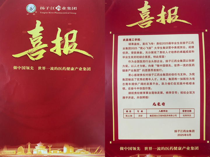 近日,武昌理工学院收到扬子江药业集团喜报,祝贺生命科学学院药学专业2025届毕业生陈义钢同学,在该集团2025“我心飞扬”大学生集训营中表现卓越,荣获“优秀学员”称号。这一荣誉既是对陈义钢个人能力的高度认可,也是学校坚持立德树人、注重人才培养质量的成果体现。