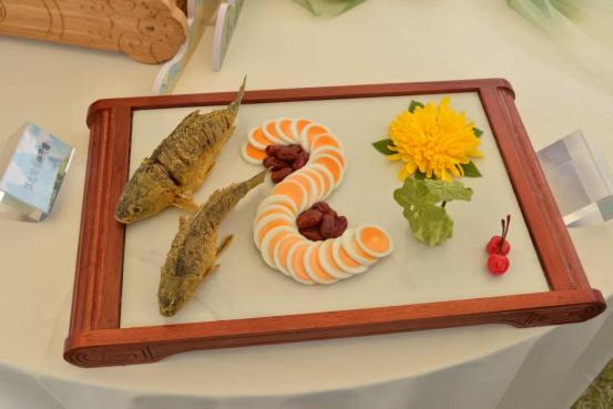 制作方法:选用淇河三宝中的鲫鱼与缠丝鸭蛋,缠丝鸭蛋因在特定水域的独特环境中形成同心圆状的色环,似“金丝伴银线”而闻名,再配以铁皮石斛、菊花、无核小枣。