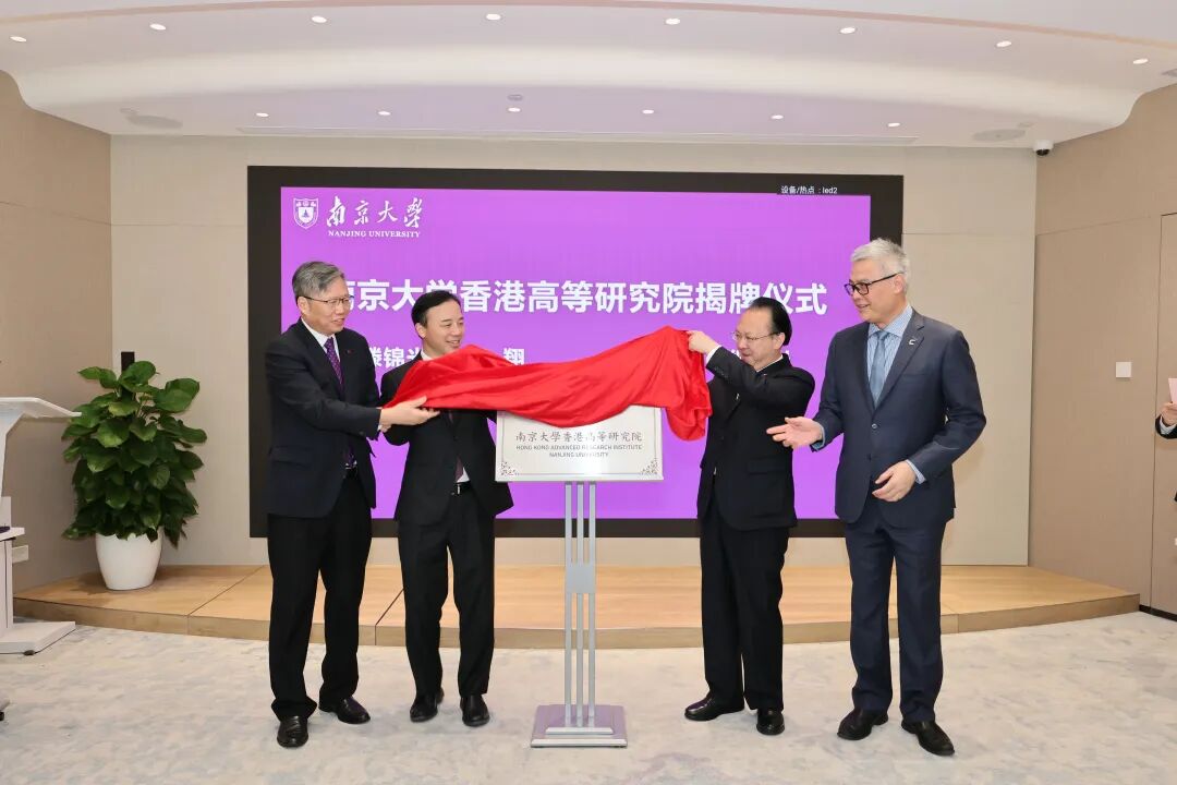 谭铁牛、香港数码港管理有限公司行政总裁郑松岩、香港大学校长张翔、香港理工大学校长滕锦光共同为“南京大学香港高等研究院”揭牌。