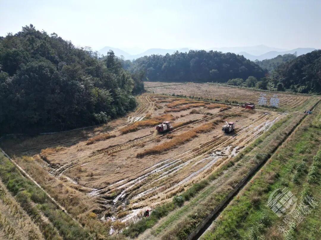 几台水稻收割机穿梭在金黄的稻田里,经过收割、脱粒、秸秆粉碎、除杂等工序,稻谷被快速收储,现场一片繁忙的丰收景象。