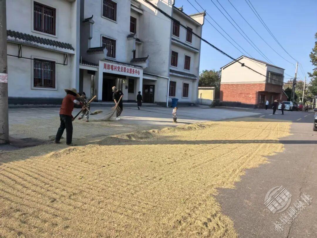 10月28日,在赤壁镇周郎嘴村村委会门口的广场和附近的空地上,村民抢抓晴好天气晒粮收粮,确保颗粒归仓,粮食安全!