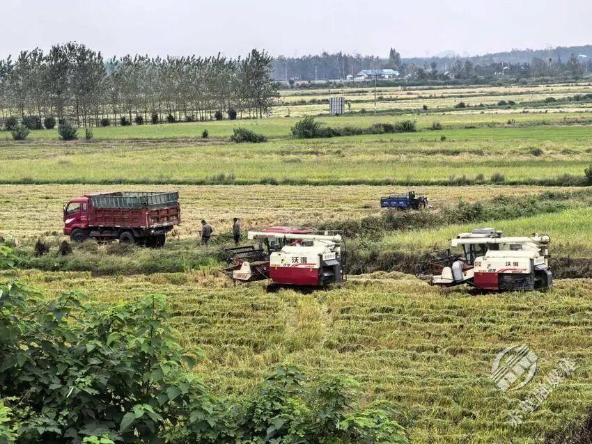 赤壁市沧湖生态农业开发区的田间地头,干部群众齐心抢收,守护千家万户的“粮袋子”和“钱袋子”。