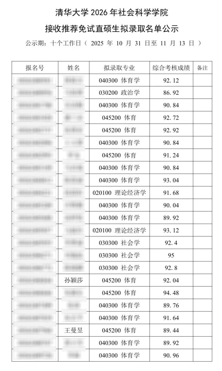 10月30日,清华大学社会科学学院发布2026年接收推荐免试直硕生拟录取名单公示。其中,乒乓球运动员孙颖莎和王曼昱进入拟录取名单。本次公示时间为10月31日至11月13日。