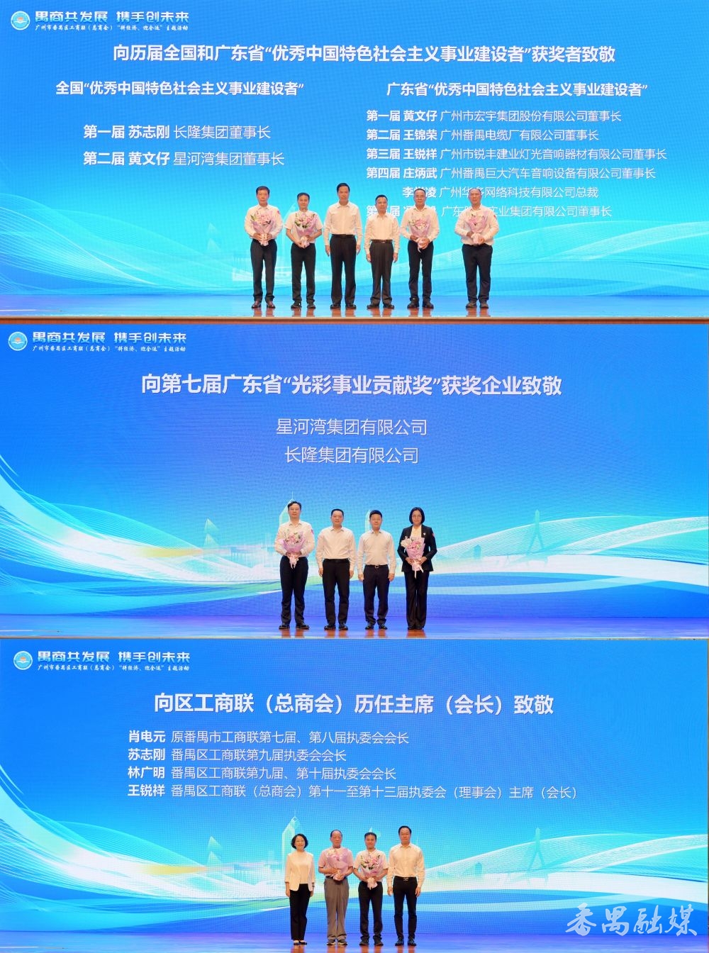 为传递对番禺企业家的关怀与激励,活动现场向王锐祥等全国、省“优秀中国特色社会主义事业建设者”致敬,向长隆集团、星河湾集团等“光彩事业贡献奖”获奖者致敬,向历任工商联主席(会长)致敬,向番禺电缆、永华家具等扎根番禺25年以上的企业致敬。同时聘任中山大学刘强教授等5位专家为“非公经济发展顾问”,为企业创新发展注入智囊力量。