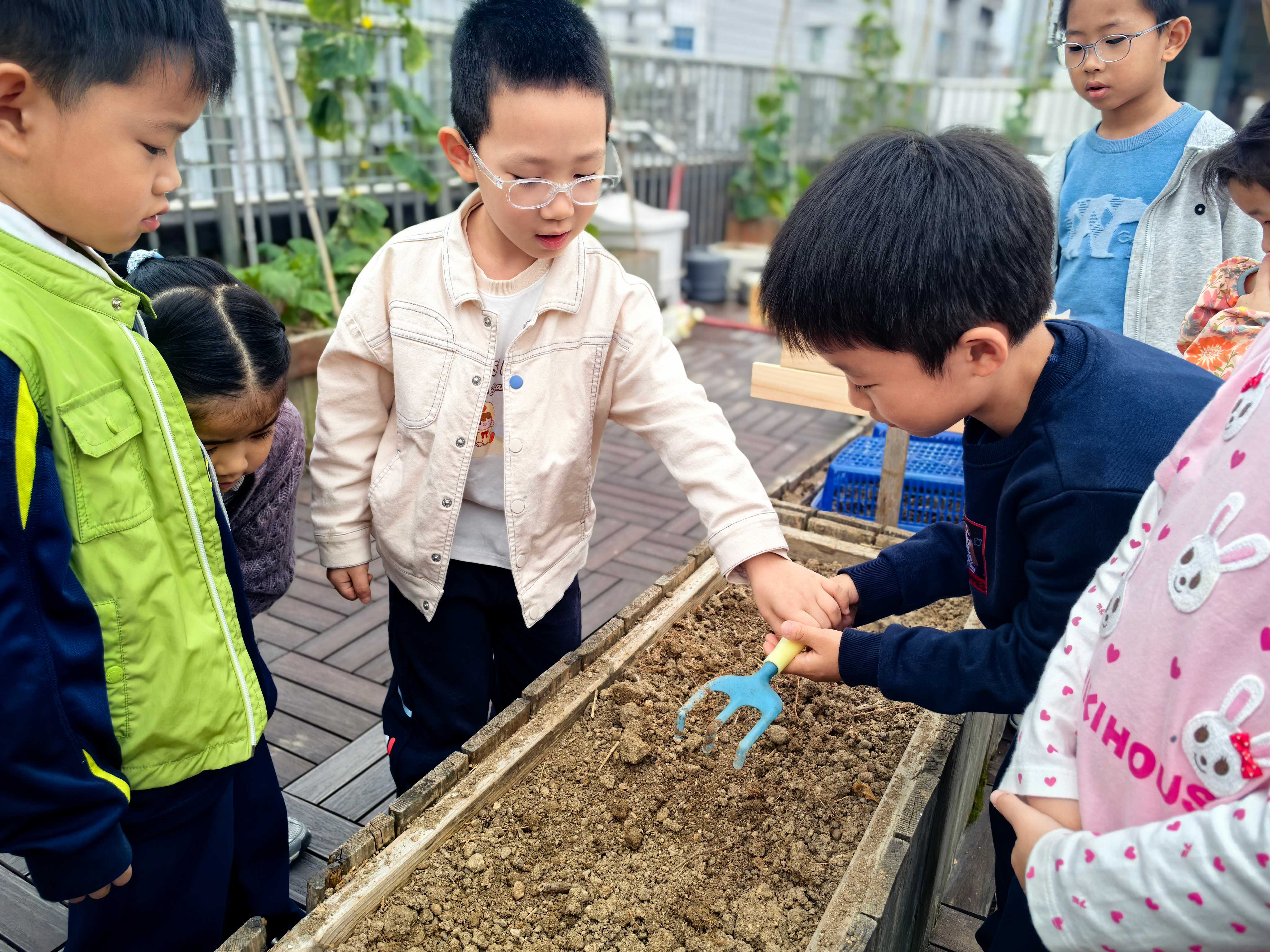 前期准备阶段,老师们购置了生菜、油麦菜、小葱、香菜、小白菜等适合秋天播种,且生长期较短的蔬菜种子。播种是在10月28日,各班“一种一框”分配材料,每个孩子都领到了专属工具和种子。在老师指导下,孩子们先用小铁耙平整土壤,有的小朋友甚至用小手去按压土地,和大自然亲密接触。然后是挖浅坑、放种子、覆薄土,孩子们对此很感兴趣,每个动作都做得格外认真。有的怕种子被风吹走,特意用小手轻压土壤;有的小朋友把种子放得太密集,旁边的小伙伴帮着疏散,其间不时传来“我的种子会长大吗”“要浇水吗”等可爱提问。