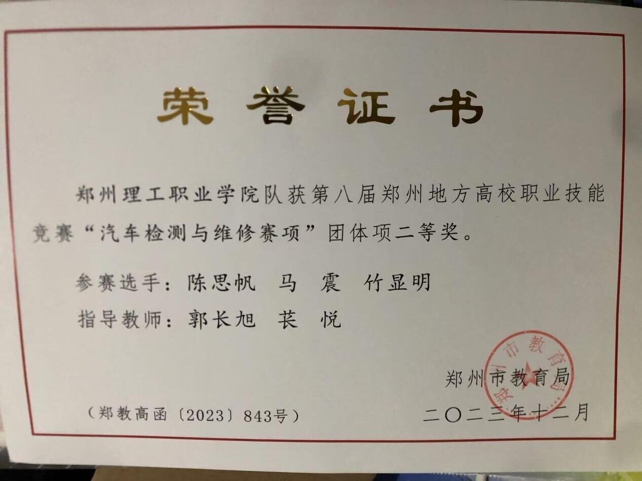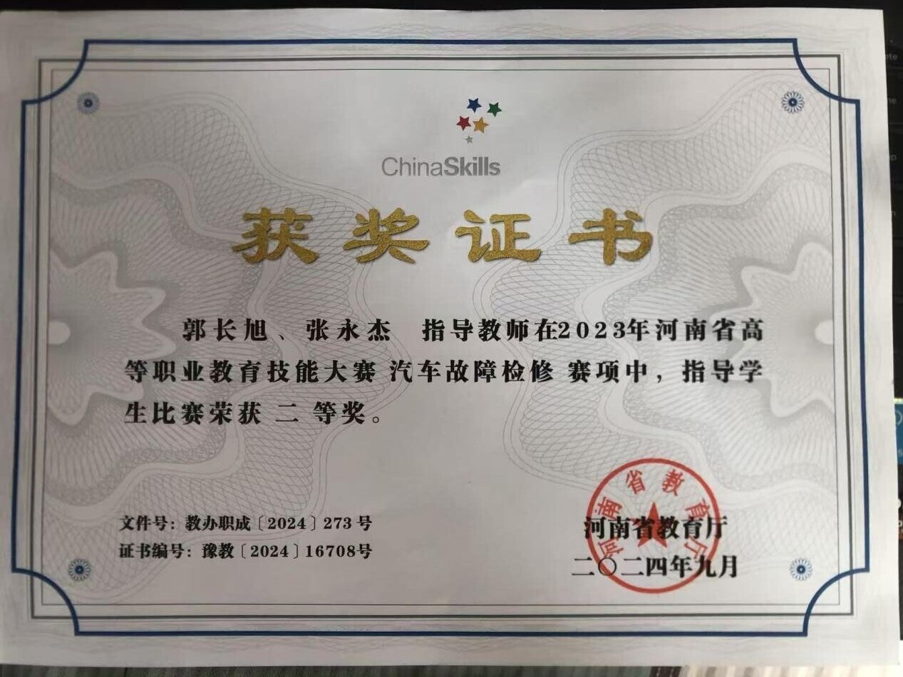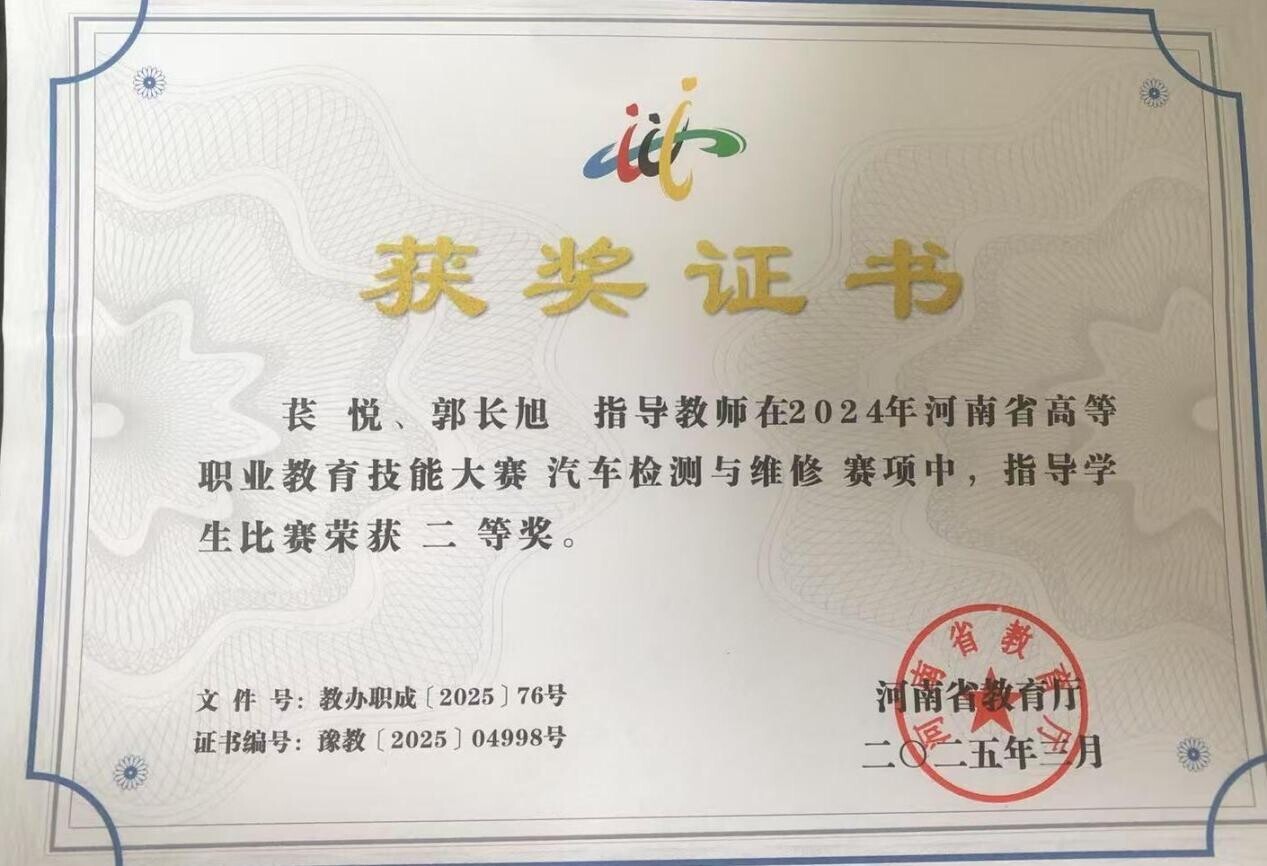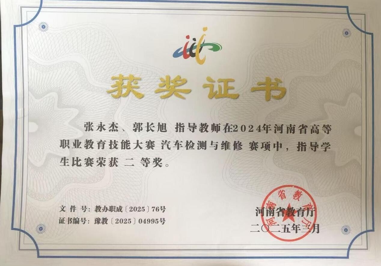 如果说课堂是教学的“主阵地”,那么技能大赛的赛场,便是郭长旭检验教学成果、锤炼学生能力的“练兵场”。2023至2025年间,他指导的学生先后在郑州市汽车故障诊断排除赛项、河南省汽车技术赛项、汽车检测与维修赛项中斩获二等奖,一张张奖状的背后,是他无数个与星光为伴的备赛日夜。