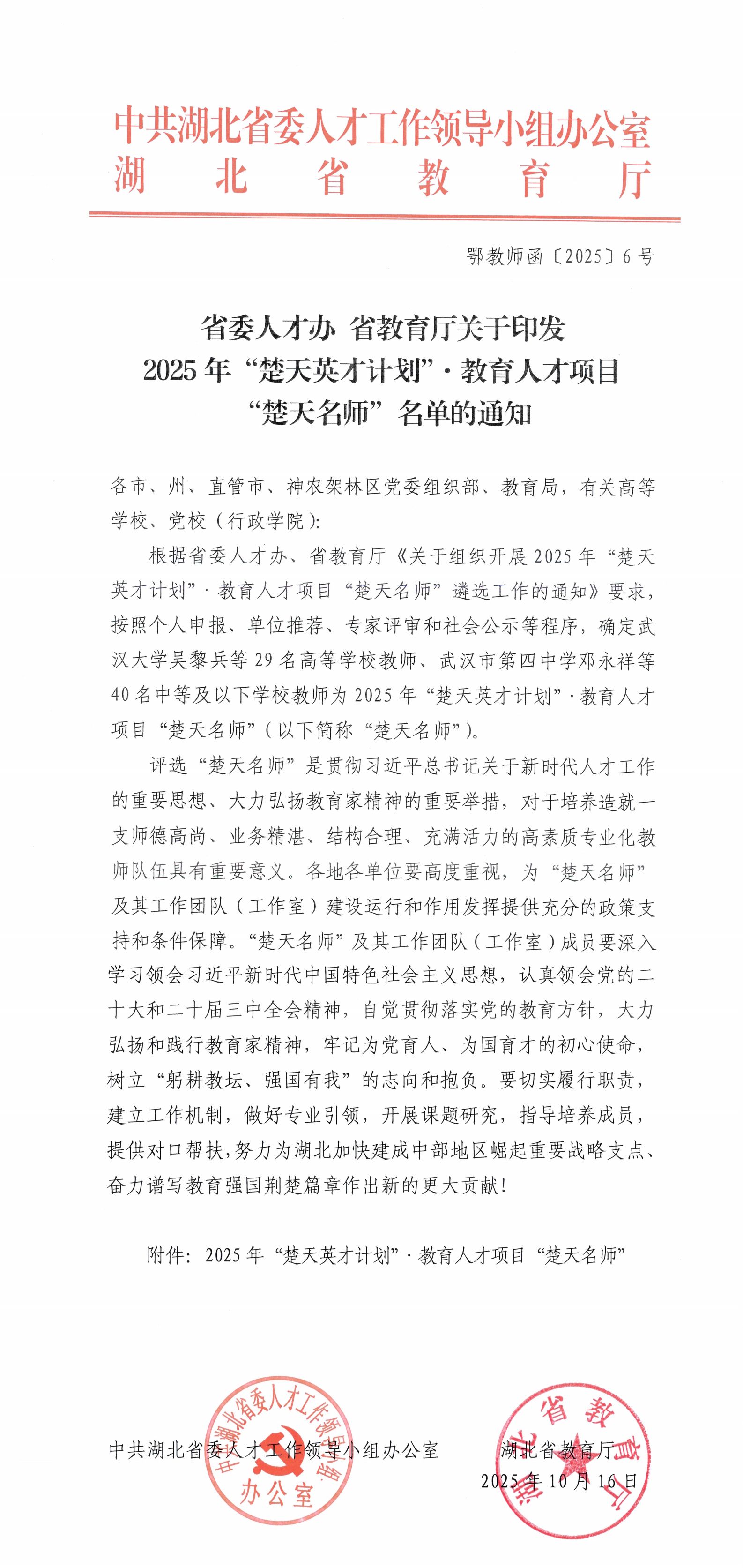 评选“楚天名师”是贯彻习近平总书记关于做好新时代人才工作的重要思想、大力弘扬教育家精神的重要举措,对于培养造就一支师德高尚、业务精湛、结构合理、充满活力的高素质专业化教师队伍具有重要意义。评选程序严格,经个人申报、单位推荐、专家评审和社会公示等环节,最终确定入选名单。
