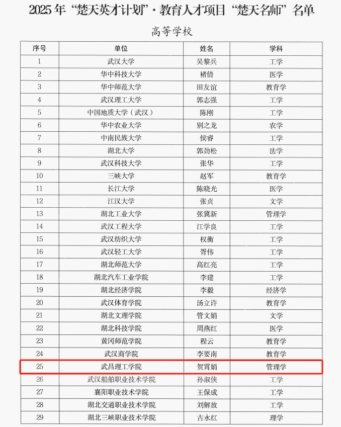 近日,湖北省教育厅正式公布2025年“楚天英才计划”·教育人才项目“楚天名师”名单,29名来自全省高等学校的教师获评“楚天名师”。武昌理工学院商学院贺霄娟教授成功入选,并成为全省同类高校中唯一获此殊荣的教师。