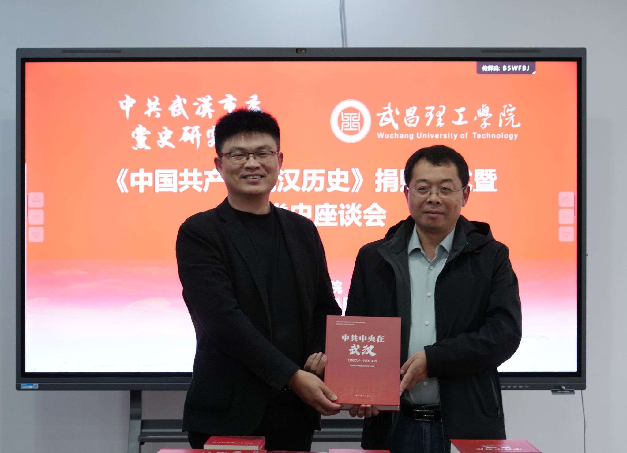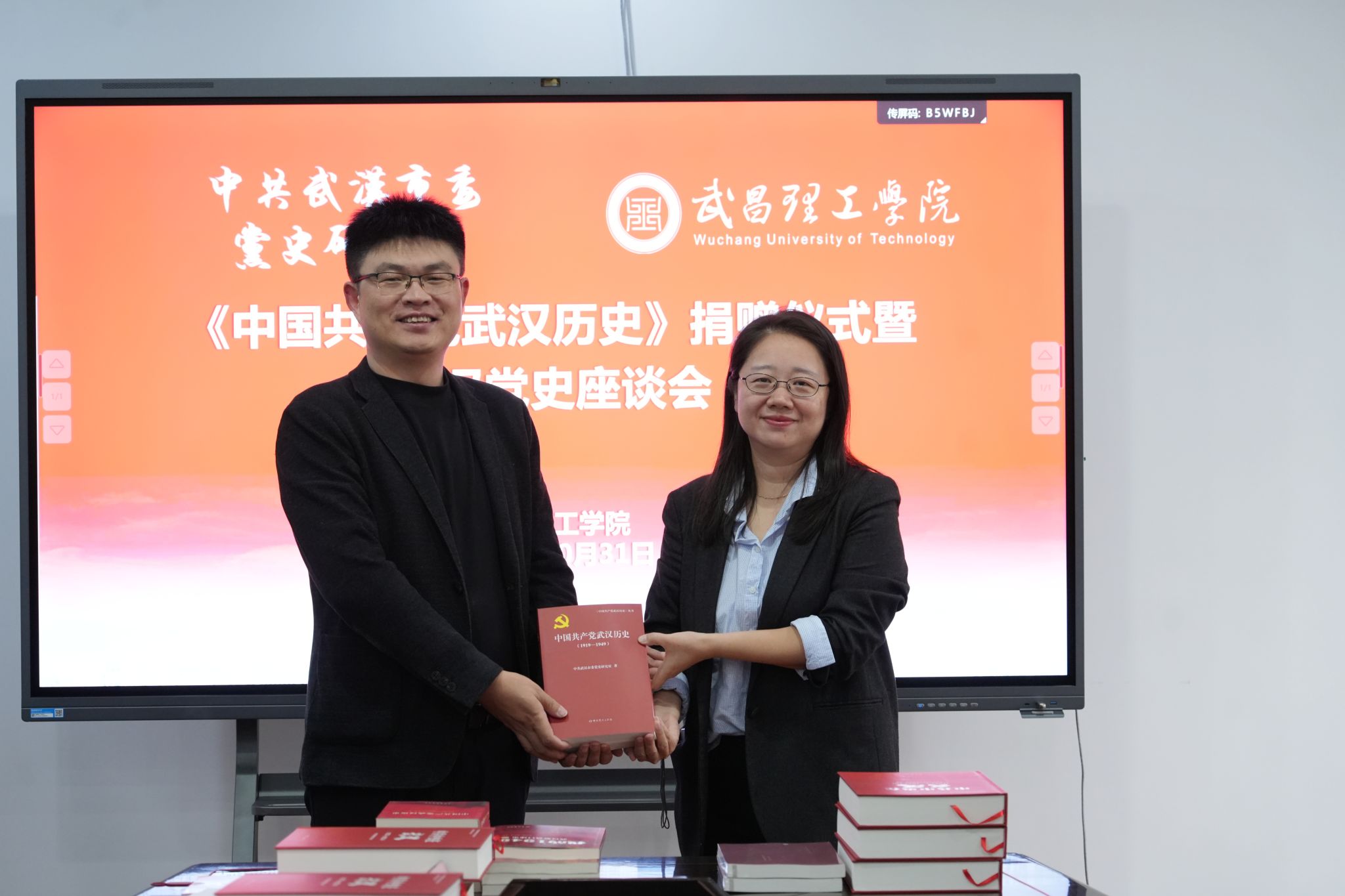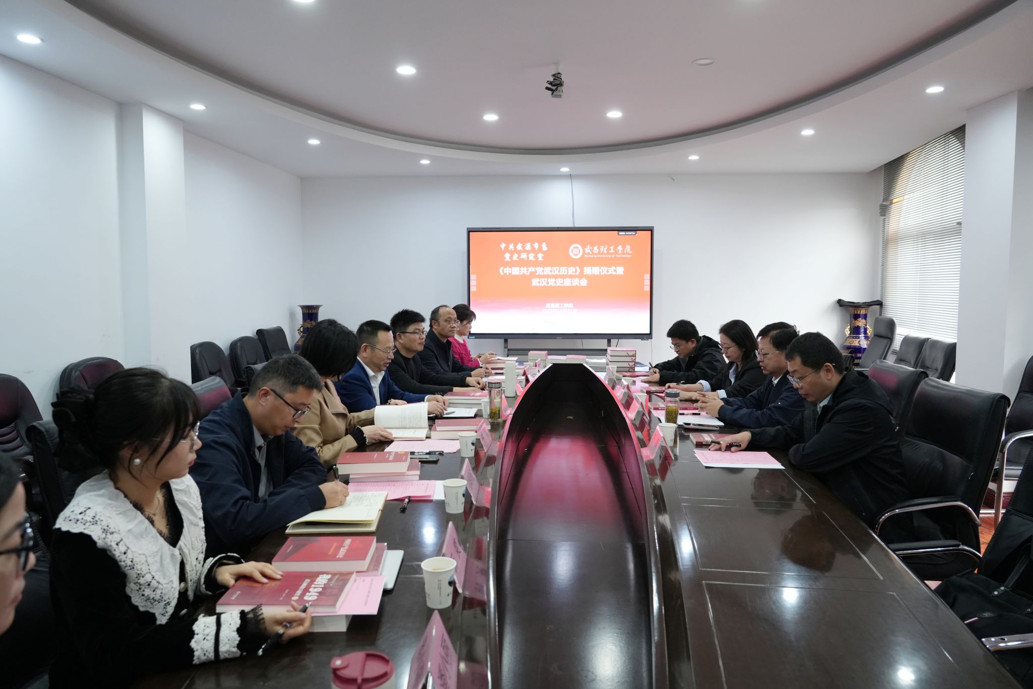 捐赠仪式由武昌理工学院党委副书记、副校长林娟教授主持。在与会人员的共同见证下,中共武汉市委党史研究室宣教处处长周薇、编研一处处长陈磊将承载着武汉厚重党史的书籍《中国共产党武汉历史》《中共中央在武汉》《我的1949:武汉解放口述史》《武汉英烈》等近150册,正式移交至武昌理工学院马克思主义学院副院长曾晓辉手中。座谈会上,双方围绕党史学习、教育、研究与传播进行了深入交流,并规划了未来合作蓝图。