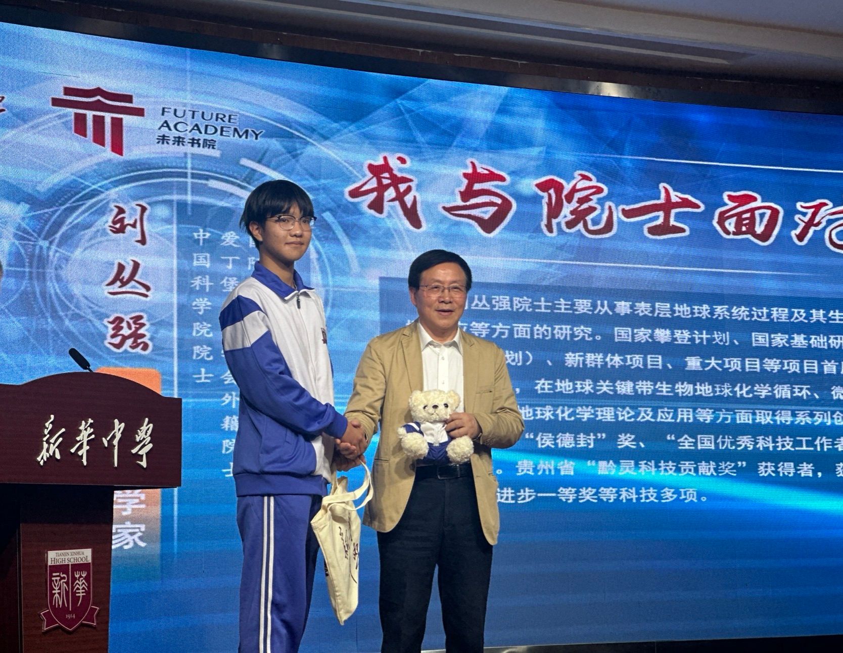 秋日的五大道,梧桐叶镶着金边,银杏缀满枝头,暖阳透过斑斓的枝叶洒下,将街道织成一幅温柔的画卷。路上,一位背着黑色双肩包的学者步履铿锵,包侧隐约露出的电脑边角,藏着他为青少年准备的 “地球密码”—— 他正是中国科学院院士、天津大学地球系统科学学院院长刘丛强。11 月 5 日下午,他专程走进天津市新华中学,以一场题为《全球变化与人类未来》的科普报告,为师生们开启探索地球科学的大门。