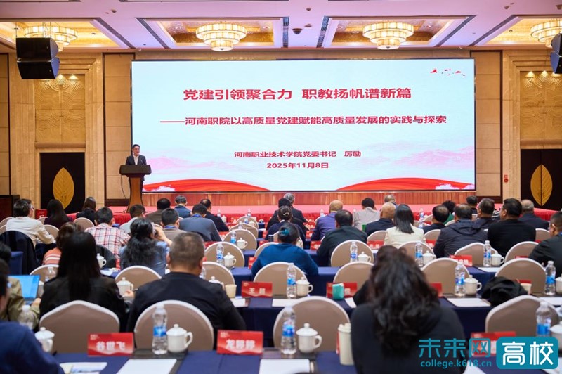 会上,厉励在“党的建设”分论坛作题为《党建引领聚合力,职教扬帆谱新篇——河南职院以高质量党建赋能高质量发展的实践与探索》的专题报告,系统分享了学校近年来党建工作的创新实践与探索。报告指出,学校全面贯彻党的教育方,牢牢锚定“为党育人、为国育才”的立德树人根本任务,紧扣办学治校中心工作,构建起以“四五四五”党建工作体系为核心的高质量党建格局,探索形成“政治引领定向、强链筑基固本、创新赋能提质、服务增效惠民”的实践路径。通过以高质量党建引领学校高质量发展、高效能治理、高水平安全,学校切实将党的政治优势、组织优势转化为治理效能与发展动能。