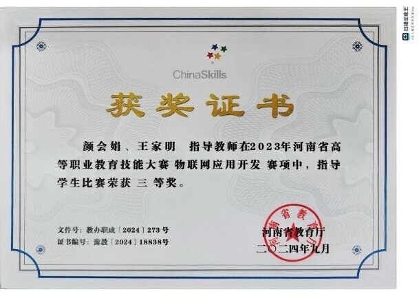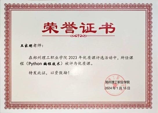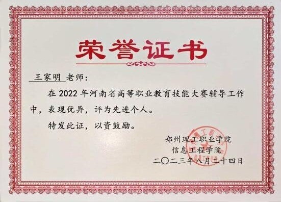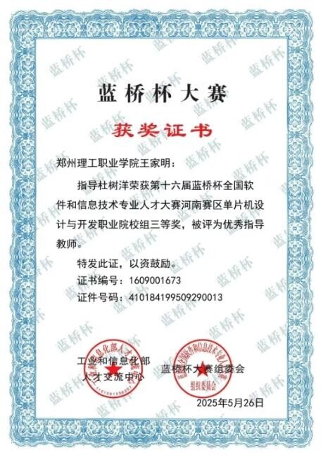 荣誉是对王家明教学成果与专业追求的最好诠释。自2022年起,他连续多年在河南省高等职业教育技能大赛中荣获佳绩,2次荣获物联网技术应用赛项三等奖优秀指导教师称号。2025年,他更是指导学生荣获第十一届河南省大学生机器人竞赛机器人走迷宫赛二等奖,以及第十六届蓝桥杯全国软件和信息技术专业人才大赛河南赛区单片机设计与开发职业院校组三等奖,展现了其突出的指导能力与学生培养成果。此外,他还2次被评为校级优秀教师,所担任的《Python编程技术》课程2次被评为校级优质课,这些荣誉不仅是对他个人能力的认可,更是对他教学热情的肯定。