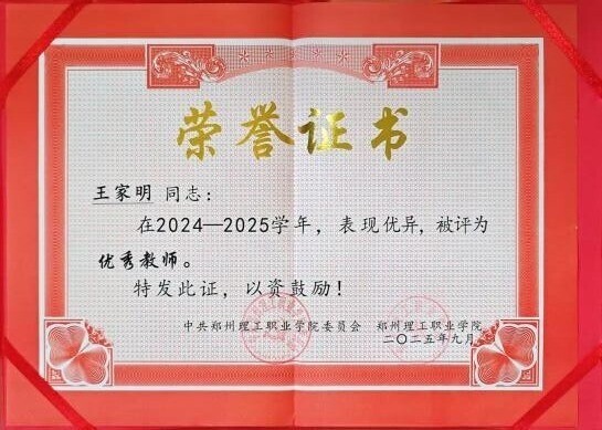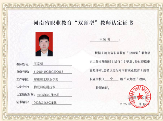 2025年,王家明被认定为河南省职业教育中级“双师型”教师,这一荣誉不仅是对他教学能力与实践经验的双重肯定,更是对他未来在职业教育领域发挥更大作用的期许。他用自己的实际行动,诠释了“双师型”教师的深刻内涵,即既具备扎实的理论知识,又拥有丰富的实践经验,能够为学生提供全方位、多层次的学习指导。