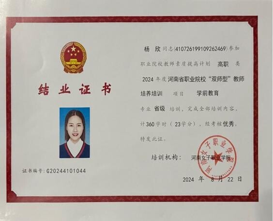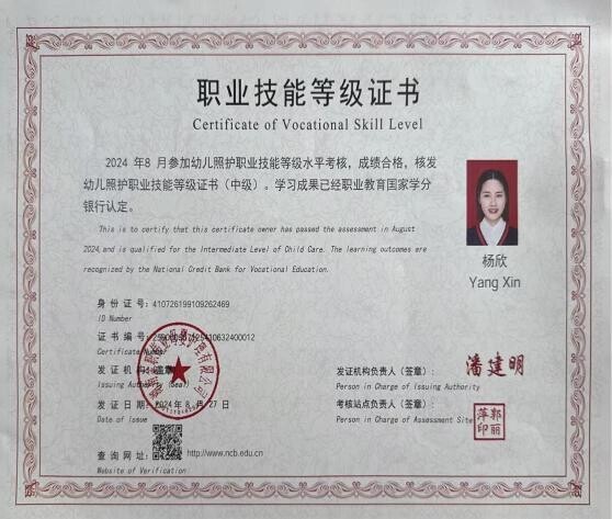 在深耕国际教育事业的同时,她主动承担教学相关任务,为更好赋能学生成长,始终注重自身教学能力与专业素养的提升。2024年积极参加河南省高职院校“双师型”教师培养培训项目,凭借扎实表现获评优秀,成功斩获河南省职业教育“双师型”教师资质认证。获得中级幼儿照护职业技能等级证书,为教学工作夯实实践基础。