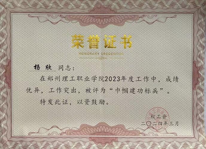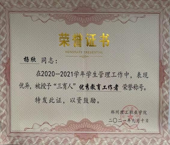 杨欣先后荣获校级“优秀教育工作者”“优秀共产党员”“巾帼建功标兵”国家级“国青杯第五届艺术设计大赛”优秀指导教师等多项荣誉称号。累计发表4篇期刊论文,获得2项实用新型专利,参与3项郑州市社会科学调研课题,用实际行动诠释着“学高为师、身正为范”的初心。