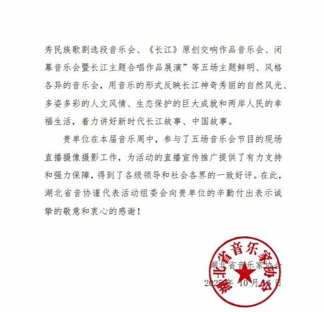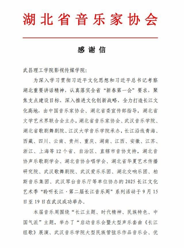 “贵单位在本届音乐周中,参与了五场音乐会节目的现场直播摄影工作,为活动的直播宣传推广提供了有力支持和强力保障,得到了各级领导和社会各界的一致好评。”近日,湖北音乐协会向武昌理工学院影视传媒学院发来一封感谢信,对其在“聆听长江·第二届长江音乐周”中的积极参与,以及做出所做出的贡献表示感谢。