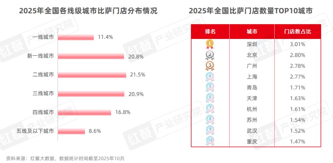 例如,必胜客2024年新增门店中超过六成是在三线及以下城市,截至2025年10月,必胜客在三线及以下城市的门店数占比已超过三成。达美乐2025年新入驻的城市以二线城市和三线城市为主,截至2025年10月,其一线城市的门店数占比已从2024年初的60%降至40%。此外,还有部分比萨品牌主攻下沉市场,如披萨速递、三只熊披萨、City1+1城市比萨等。