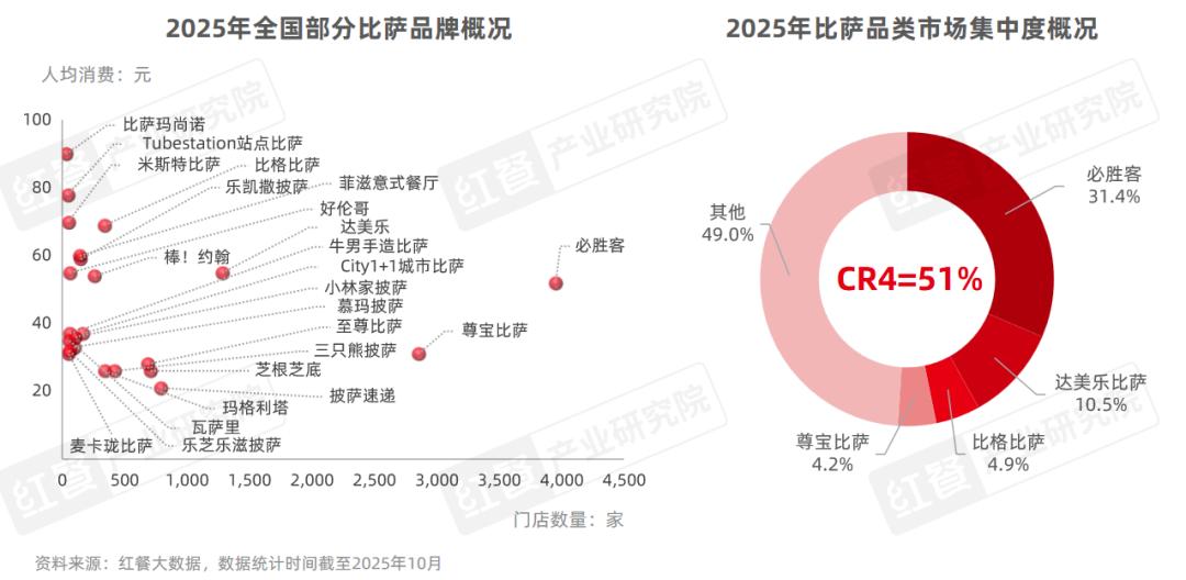 与此同时,比萨品类的高连锁化也推动着比萨市场集中度的提升。基于各品牌的财报数据以及公开信息披露,红餐产业研究院测算,2025年必胜客、达美乐比萨、比格比萨和尊宝比萨四大品牌将有望合计占据51%的市场份额。