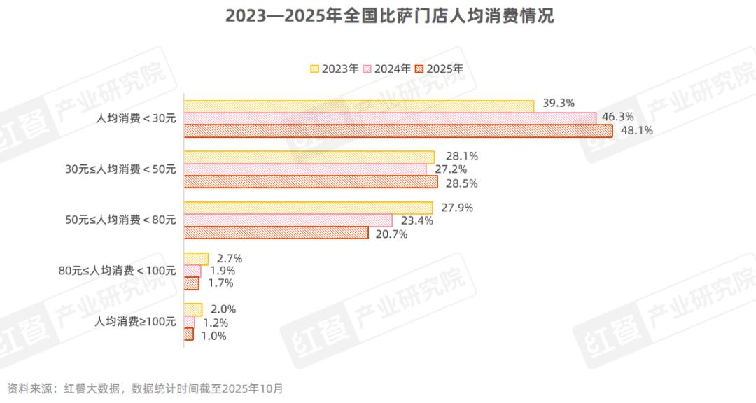 近年来,随着性价比消费需求的持续攀升以及快餐类比萨门店的快速增长,比萨品类人均消费呈下滑态势。红餐大数据显示,截至2025年10月,人均消费在30元以下的比萨门店占比达48.1%,居于首位;其次是30~50元区间,门店数占比为28.5%;人均消费在50~80元区间的门店数占比也超过了20%;80元及以上的比萨门店占比则较少。