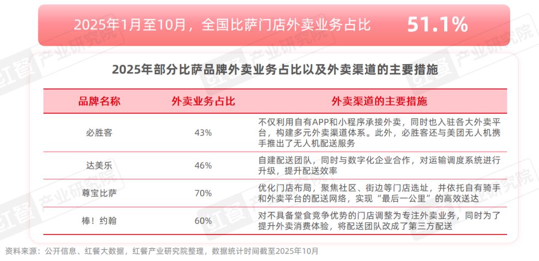 近年来,外卖已成为比萨品类的主要销售渠道之一,红餐大数据显示,2025年1月至10月,全国比萨门店外卖业务占比已达到51.1%,较2024年提升了1个百分点。众多比萨品牌也愈发重视外卖业务的发展,例如,必胜客构建了多元外卖渠道体系,其不仅依托自有APP和小程序承接外卖,同时也入驻各大外卖平台,根据其财报,必胜客2025年第二季度外卖销售额同比增长15%,外卖业务占比达到43%,较2024年同期提升了5个百分点;达美乐、尊宝比萨等品牌则主攻外卖业务,其中达美乐在一线城市的外卖业务占比超过七成。