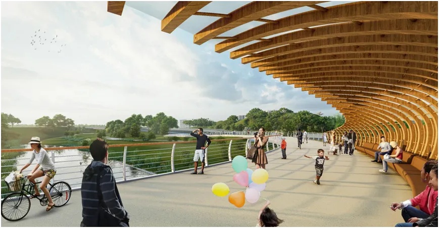 桥面设置廊架和舒适座椅,可供人停留休憩,游玩性强。廊架通过木条的排列组合,整体富有韵律和节奏感,美观且能遮阳;廊架上方覆盖的ETPE膜通透性强,也能避雨。人们可到桥上散步或玩耍,这将带来良好的生活体验,提升居民的幸福感。