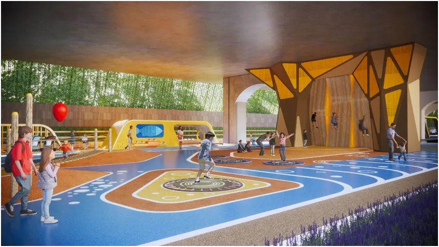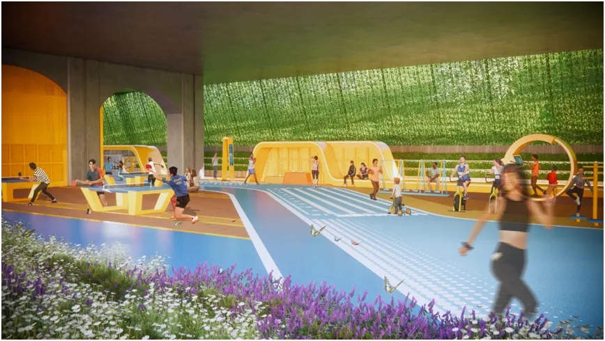 桥下愉悦全龄活动区总面积约为1.2公顷,分为分龄儿童活动空间、健身活动空间、综合服务空间、学校入口空间、球类活动空间、停车场6个主要功能区域。