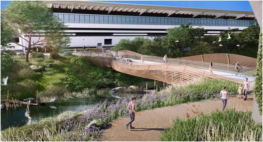 方案整体风格现代简约,以融入周围公园为主,不过分凸显桥梁。在满足快速通行需求的基础上,中间设置休闲娱乐设施,可以增加桥与人群的互动,也串联了两岸人流,实现两岸公园的资源共享,提升片区人居环境。