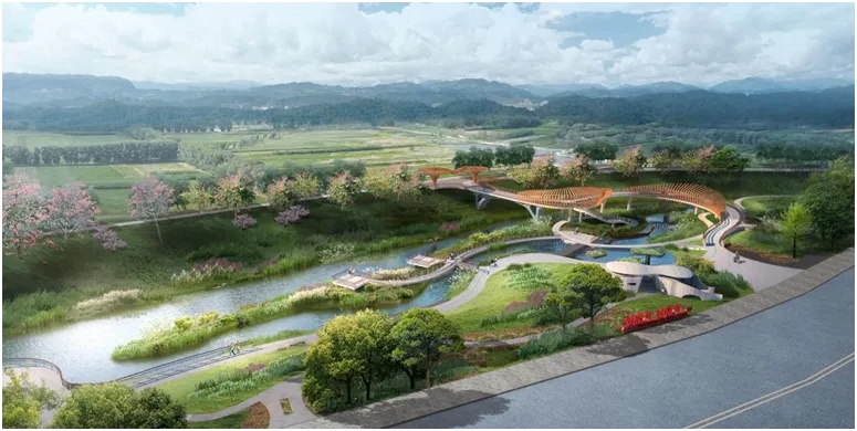 设计形象入口、生态修复及科普、全年龄活动区等3段特色景观,衔接场地主要出入口、学校,保障慢行通达性。鸢飞桥取玉岩书院中韩愈“鸢飞鱼跃”花额的意境,形态上模拟飞鸟翅膀的轨迹,曲线流畅优美,采用木色材料以更融于自然环境;解决了地铁站出行的市民过河难的问题,并连通了两岸碧道。