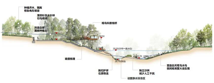 水岸多样性塑造,打造丰富的水文环境;岭南鱼耕文化的表达,农业有益动物(蝴蝶、青蛙等)栖息地营造及科普。