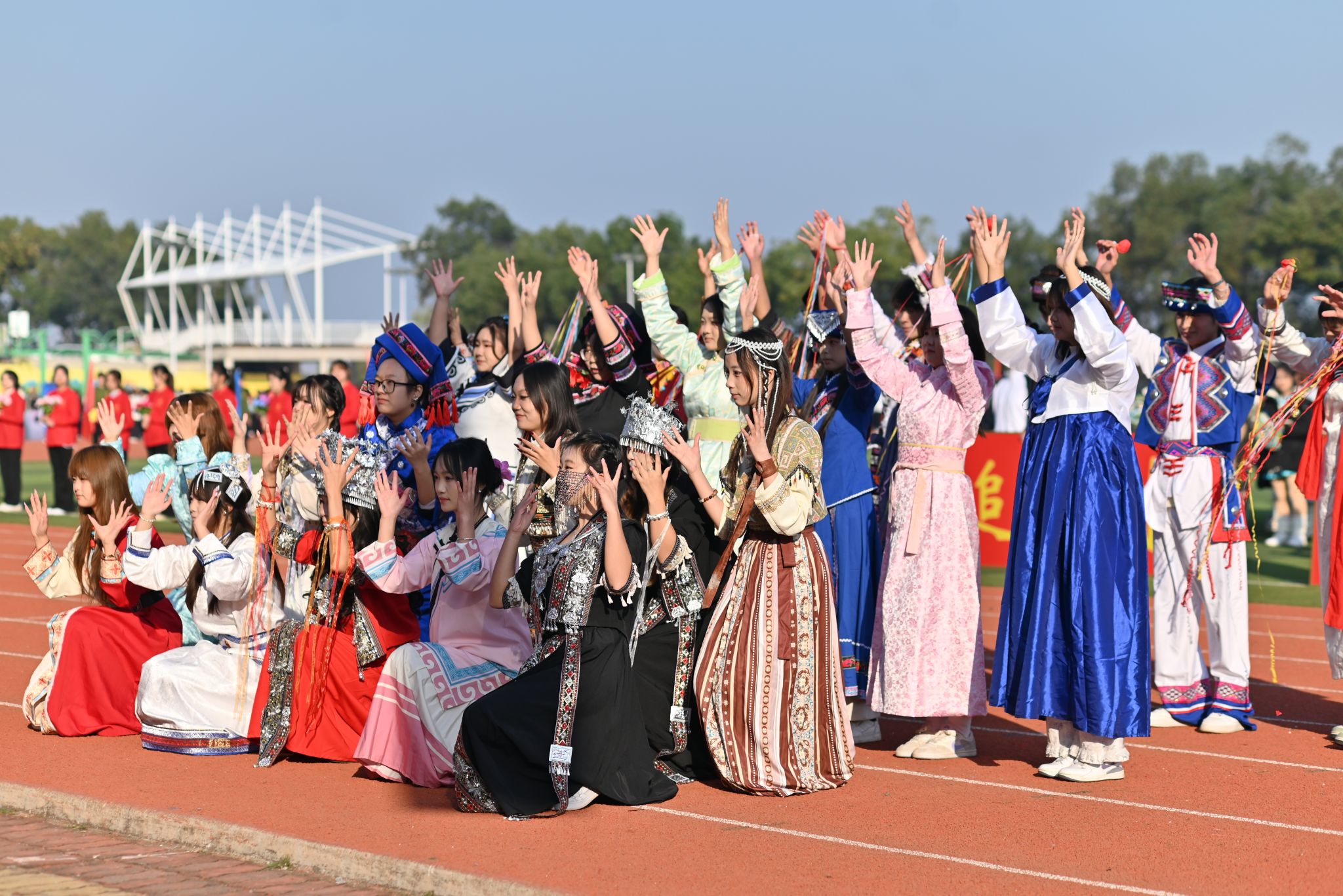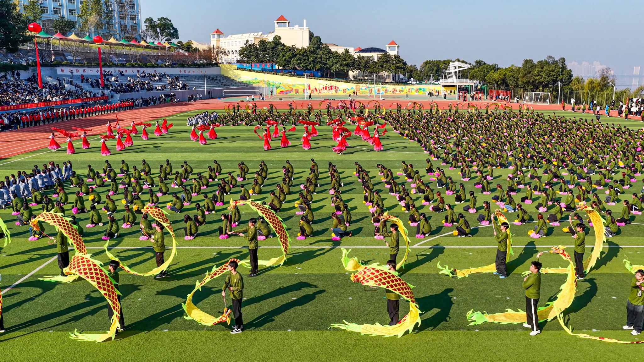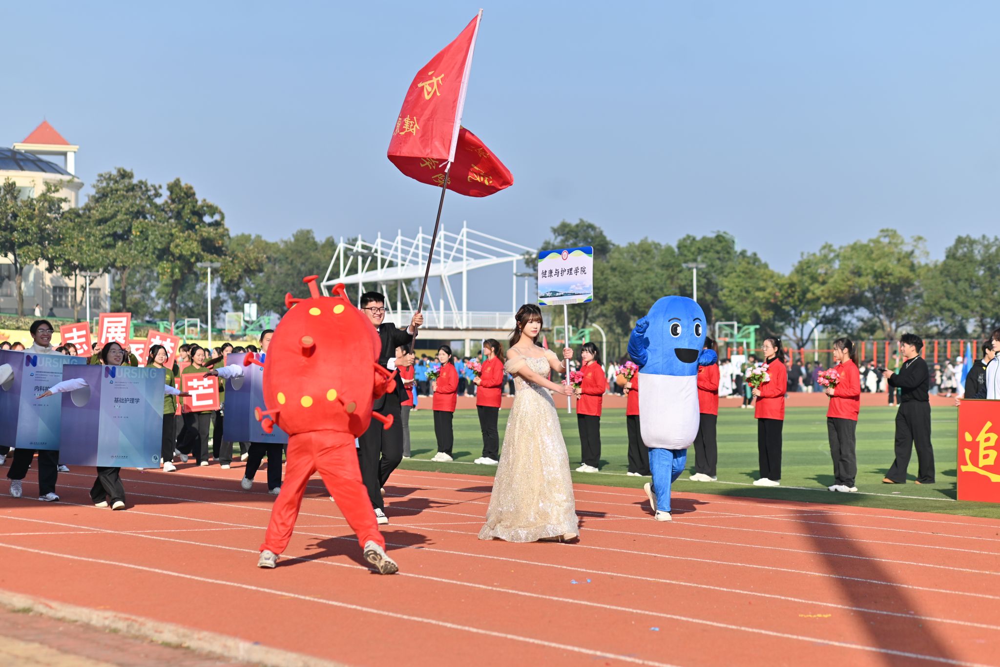特色表演环节精彩纷呈,社团表演方阵率先带来多重惊喜—古典舞蹈《兰亭序》舞姿翩跹,跆拳道表演《霍元甲》刚劲有力,武术表演一招一式尽显功底,街舞表演动感十足、燃炸全场,雅致国风与青春活力交织。压轴登场的大型团体操表演由影视传媒学院、商学院、健康与护理学院及文法学院1200余名学生共同演绎,《让我们一起出发》背景音乐响起,同学们动作整齐划一、队形变换有序,宛如流动的画卷铺展在运动场上,惊艳全场。
