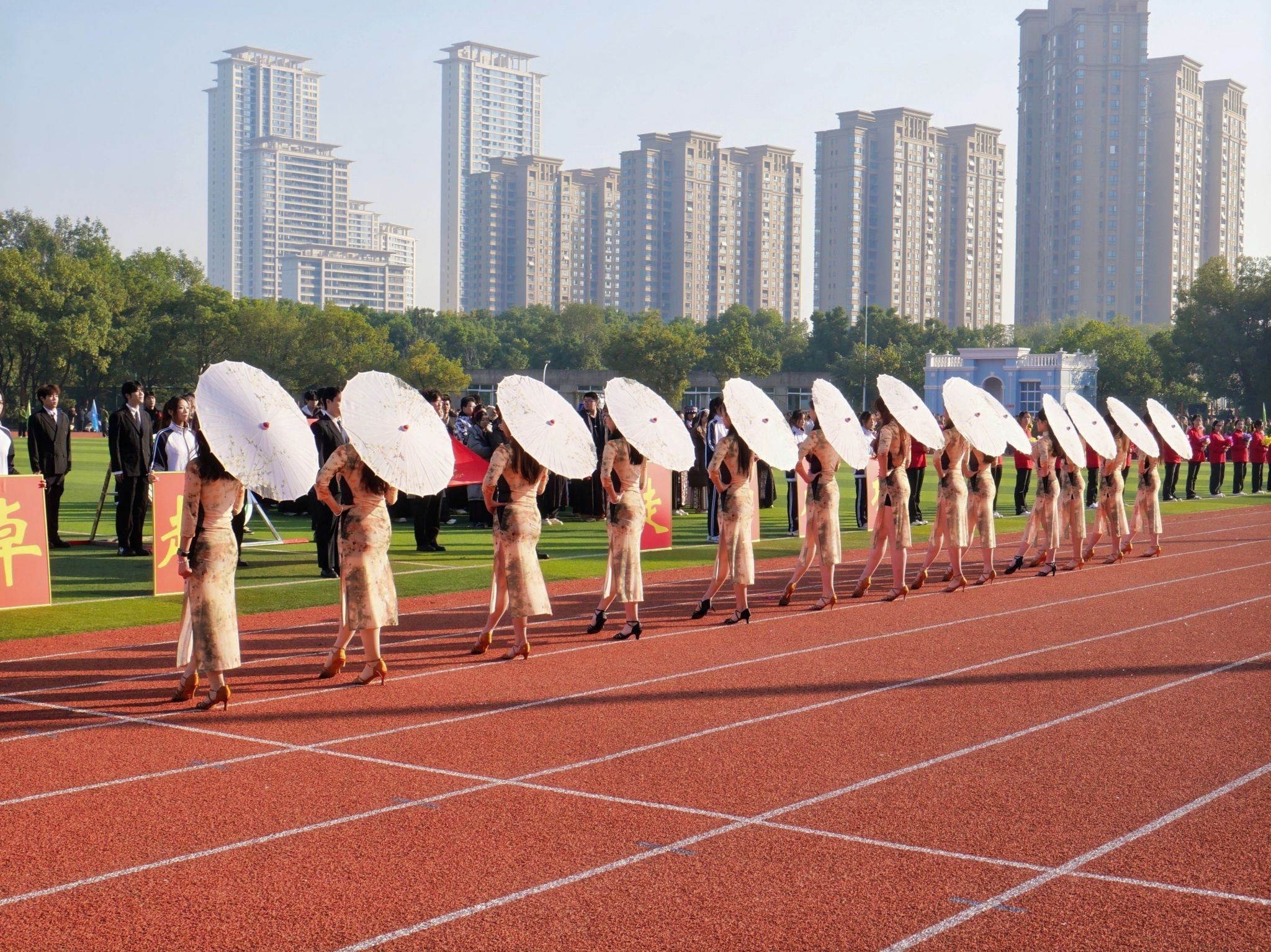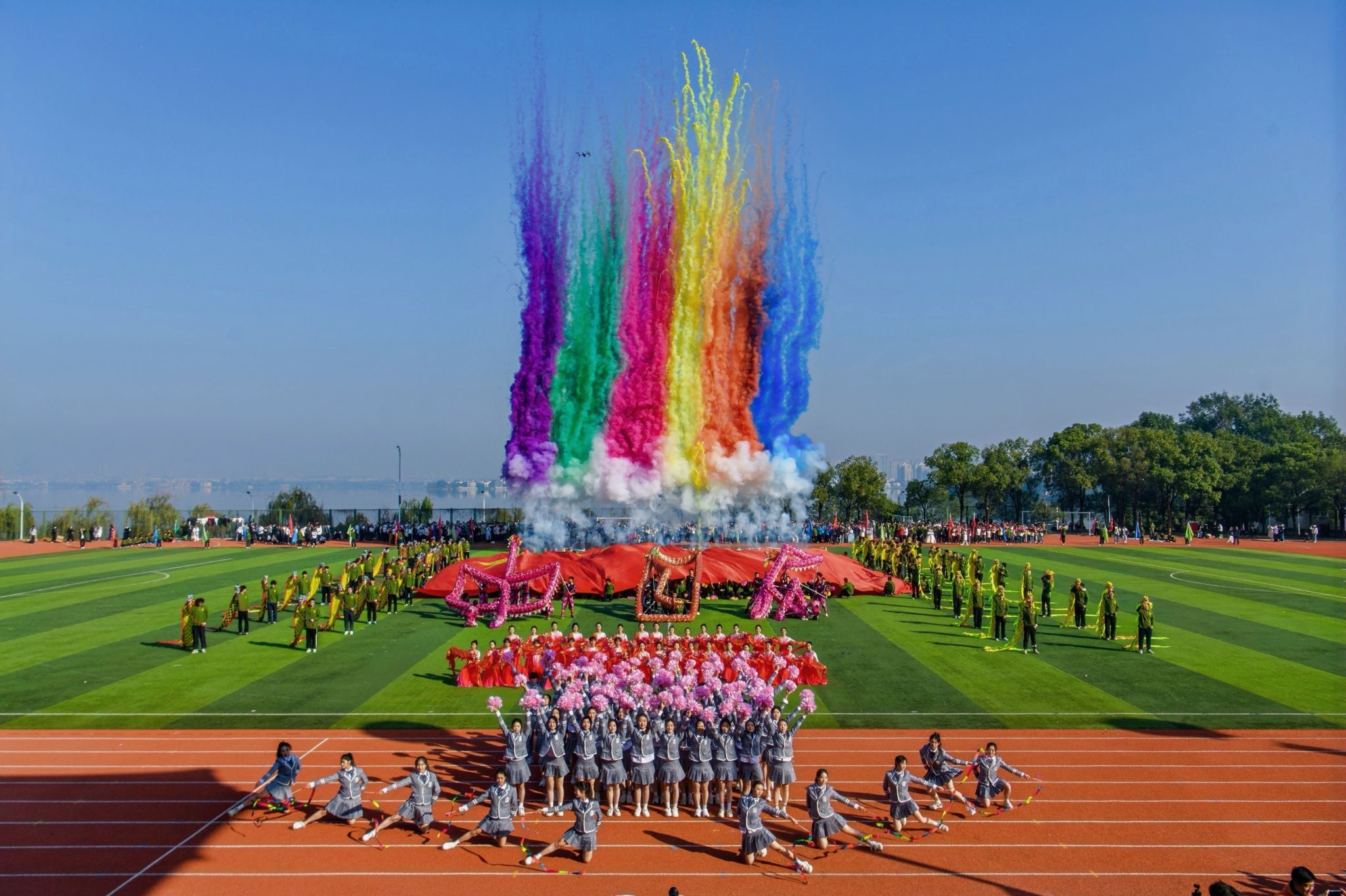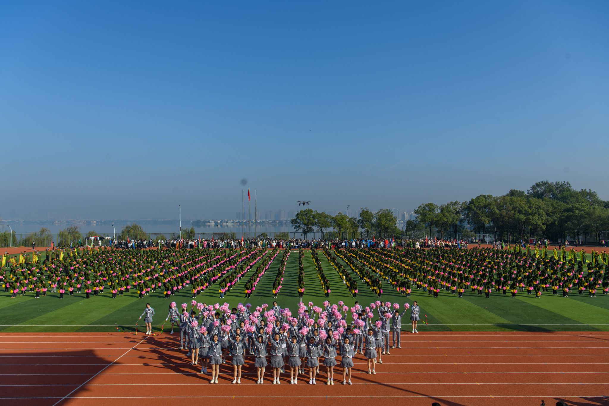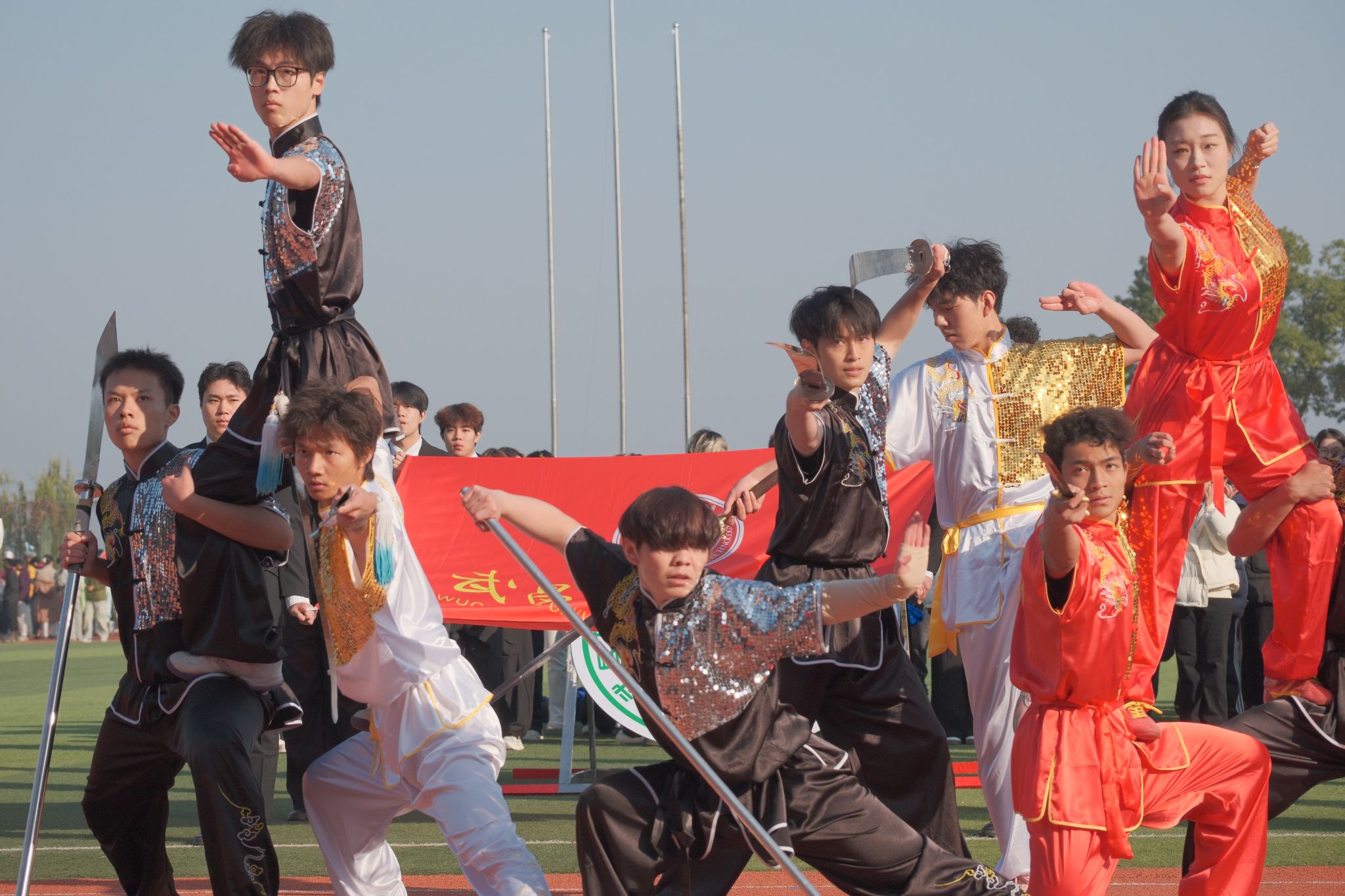 特色表演环节精彩纷呈,社团表演方阵率先带来多重惊喜—古典舞蹈《兰亭序》舞姿翩跹,跆拳道表演《霍元甲》刚劲有力,武术表演一招一式尽显功底,街舞表演动感十足、燃炸全场,雅致国风与青春活力交织。压轴登场的大型团体操表演由影视传媒学院、商学院、健康与护理学院及文法学院1200余名学生共同演绎,《让我们一起出发》背景音乐响起,同学们动作整齐划一、队形变换有序,宛如流动的画卷铺展在运动场上,惊艳全场。