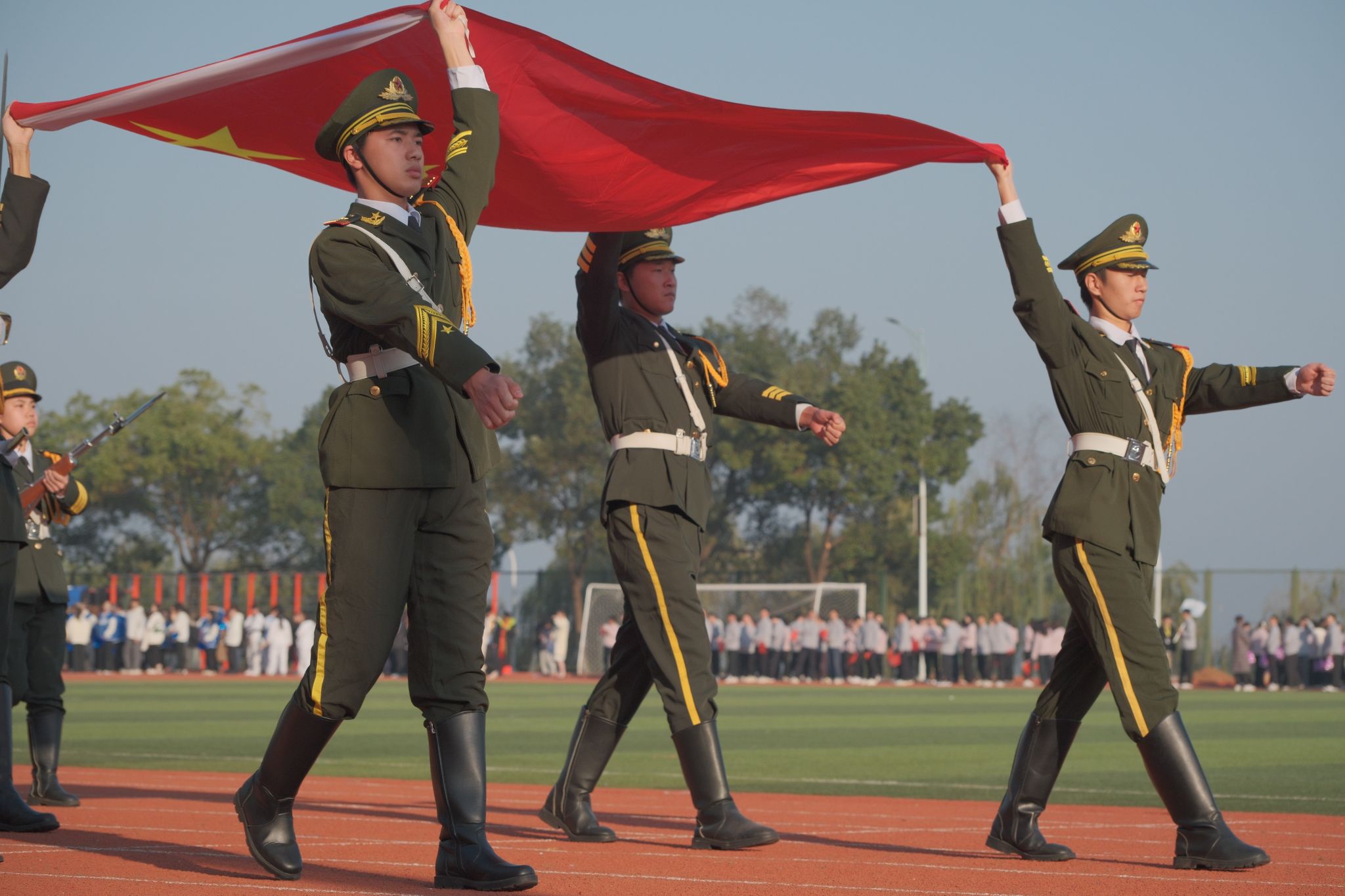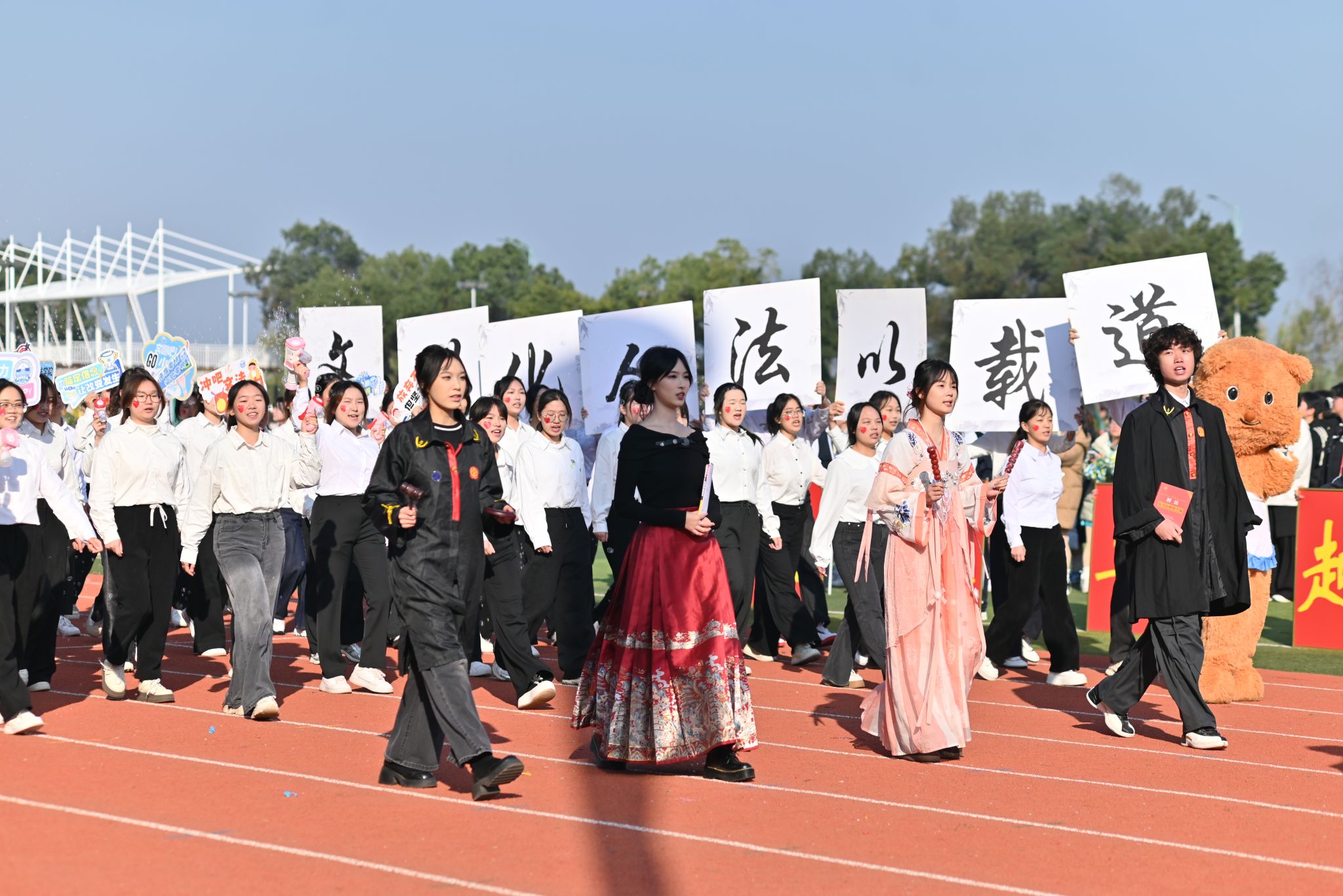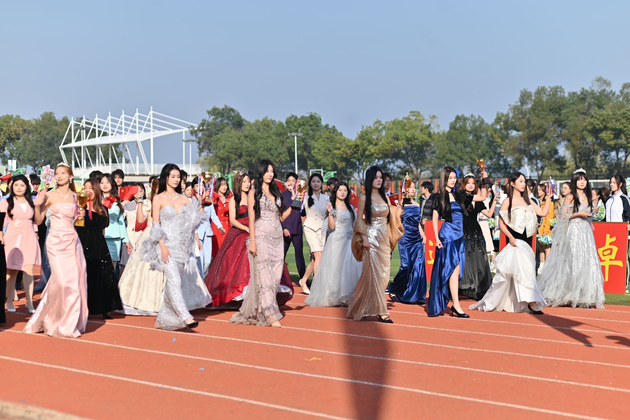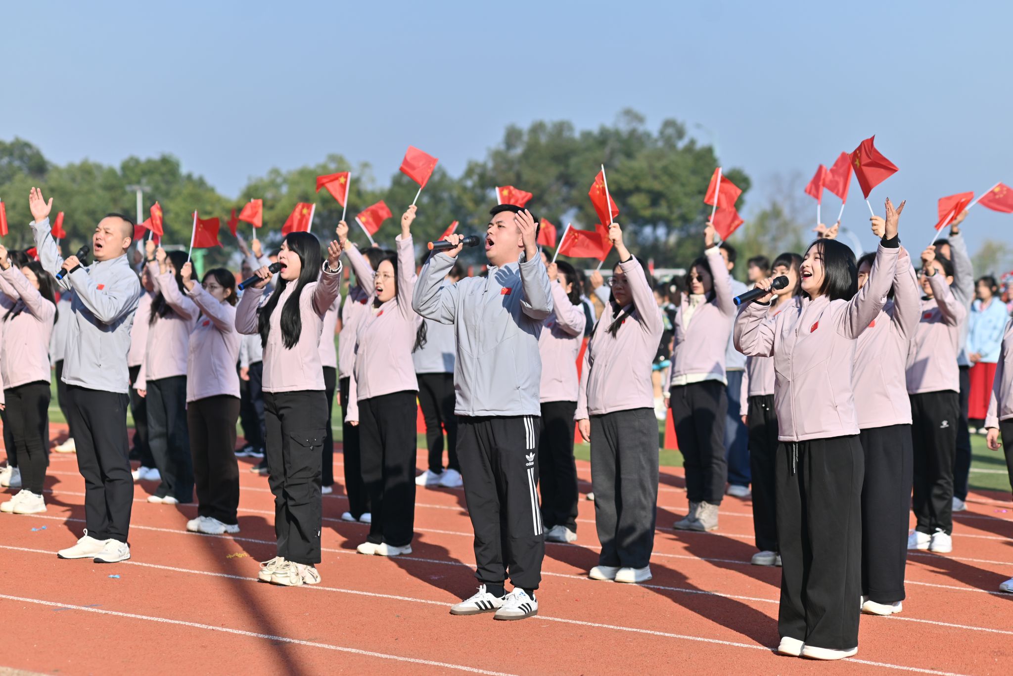 64名博士、教授组成的方阵成为全场焦点,他们身着统一服装,手擎鲜艳的五星红旗,昂首阔步走过主席台,齐声高唱《祖国不会忘记》,质朴的歌声饱含深情,以沉浸式演绎为全校师生上了一堂生动的爱国主义教育课。青年教师代表队带来的舞蹈活力四射、感染力十足,用轻快的舞步与饱满的热情点燃全场,赢得了师生们的阵阵欢呼与热烈掌声。