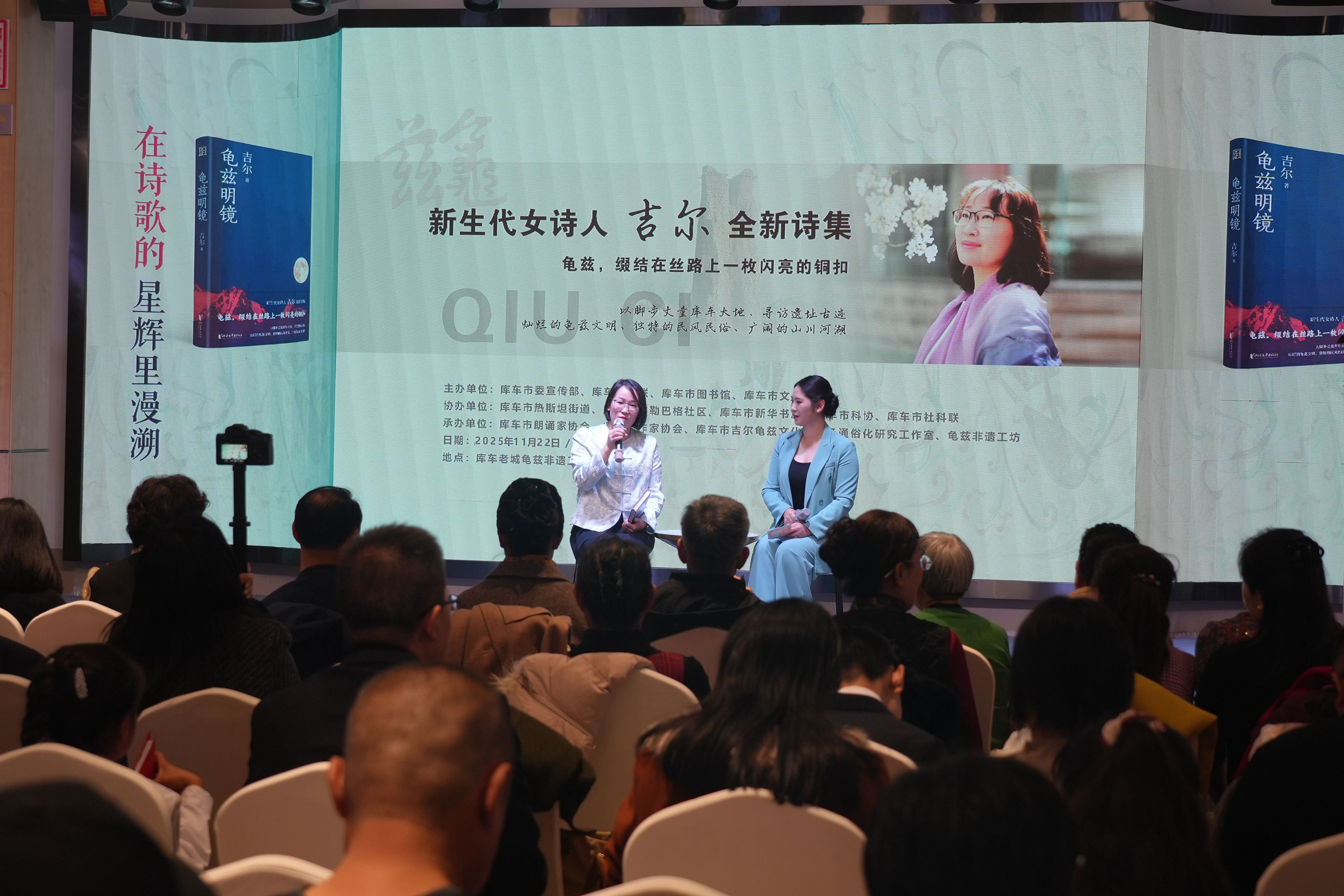 11月22日,正值小雪节气,寒意初显,在库车市的龟兹非遗工坊内,却是一片诗情洋溢、暖意融融的景象。库车本土作家吉尔新诗集《龟兹明镜》读书分享暨诵读会在此举行。活动以“在诗歌的星辉里漫溯”为主题,通过朗诵、舞蹈、音乐与走秀等多种艺术形式,将纸墨间的文字化为动人的视听体验,让观众全方位沉浸于诗歌的瑰丽世界。