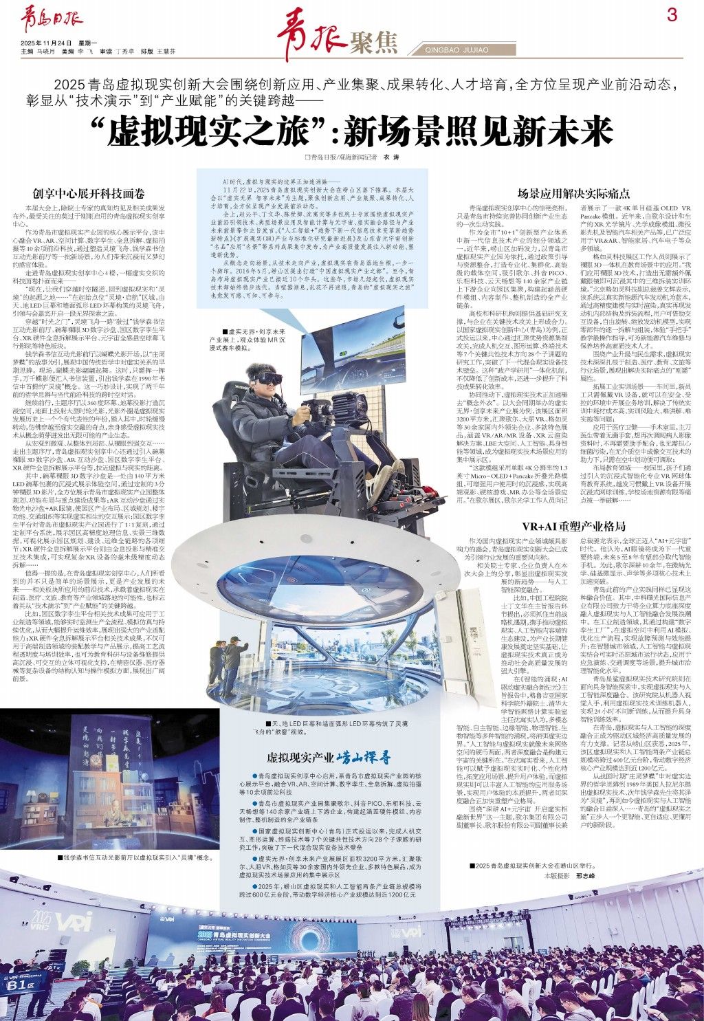 在青岛,虚拟现实与人工智能的深度融合正成为驱动区域经济高质量发展的有力支撑。记者从崂山区获悉,2025年,该区虚拟现实和人工智能两条产业链总规模将跨过600亿元台阶,带动数字经济核心产业规模达到近1200亿元。