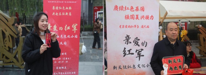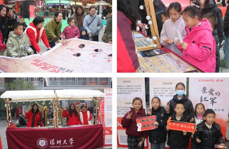 除了舞台剧表演,深圳大学传播学院还在遵义市红花岗区1935广场开展了一场别开生面的红色文化快闪打卡活动——“亲爱的红军:红色文化小站”,吸引了众多居民和游客参与。活动现场精心设置“E起解谜长征路”、“红色宣言拍照打卡”与“重走红军路”创意打卡区域,通过兼具知识性和趣味性的小游戏让参与者沉浸式了解长征文化,并提供了“亲爱的红军”主题透卡、线圈本、明信片、钥匙扣等特色红色文创产品作为打卡激励,增强参与者的体验感与获得感,为红色文化的创新传播注入时代活力。