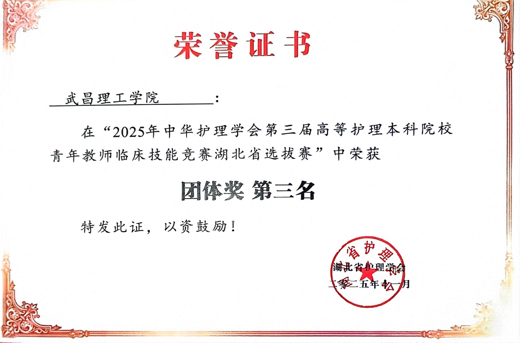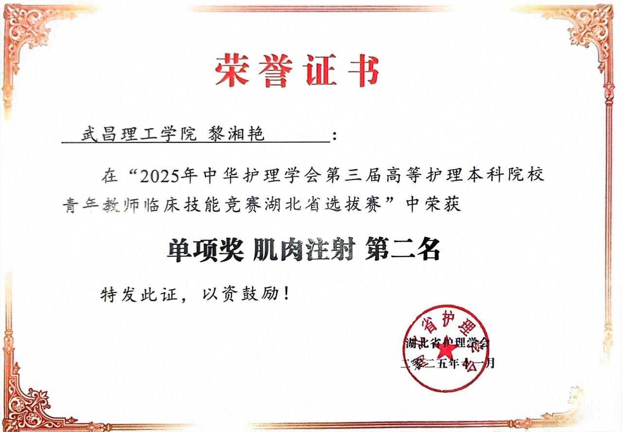 近日,2025年湖北省本科高校青年教师临床技能竞赛在武汉圆满落幕。武昌理工学院健康与护理学院选派优秀教师与武汉大学人民医院老师组成的三人团队凭借扎实的临床功底和出色的临场发挥,荣获团体三等奖的佳绩。其中,健康与护理学院黎湘艳老师和刘会会老师表现尤为突出,分别斩获“肌内注射”项目个人二等奖和“心肺复苏”项目个人二等奖,充分彰显了武昌理工学院青年教师卓越的专业技能与教学风采。