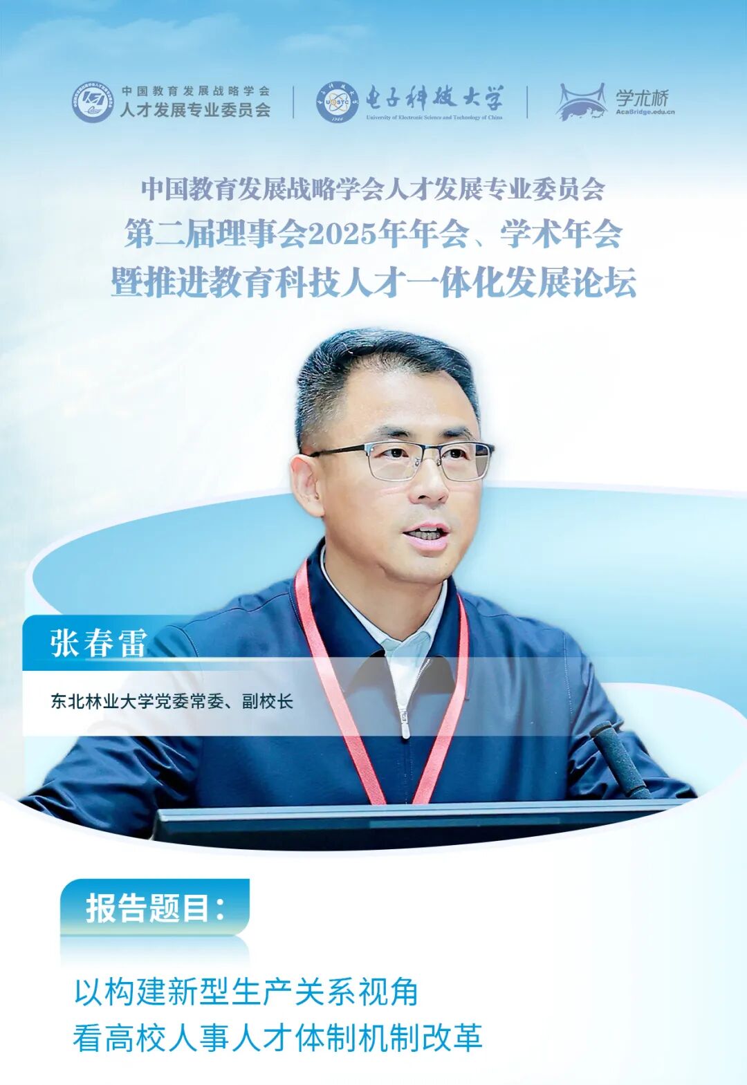 张春雷从马克思主义政治经济学的“生产关系”视角来分析人事人才体制改革。他指出,应以构建新型生产关系的视角推进人事人才体制机制改革,以适配新质生产力发展要求,并介绍了东北林业大学通过实施“成栋英才”计划精准引才,建立分类评价体系,深化绩效分配制度改革,实现“能上能下”的动态管理,这一系列改革破除了制约人才发展的体制机制壁垒,构建起人才发展新生态。