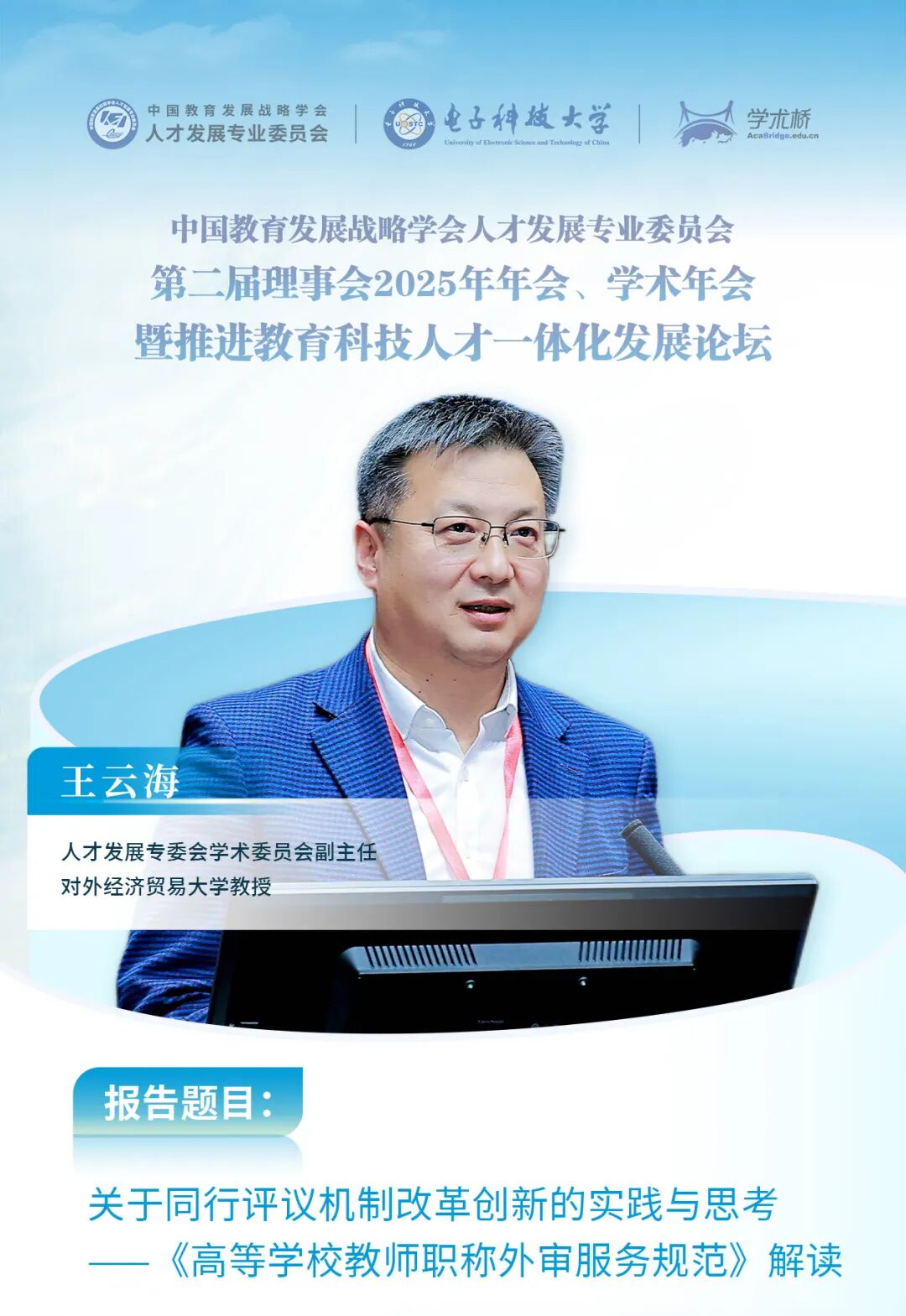 王云海分享了对同行评议机制改革创新的实践探索与思考,重点对中国教育发展战略学会新近发布的《高等学校教师职称外审服务规范》团体标准进行了解读。他说,该项标准是人才发展专委会落实教育部和中国教育发展战略学会推进教育标准化工作的具体举措,是聚焦同行评议机制和代表性成果评价制度改革创新的实践探索。对高校教师职称外审工作中的专家库建设、专家匹配和遴选、代表性成果分类、外审服务流程等工作进行规范,希望能为高校教师职称外审工作提供规范化指引。标准的发布实施将有效提升人才评价质量,对推动教育评价改革,构建科学、公正的高校人才评价体系具有重要意义。