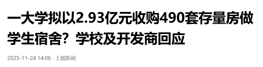 上观新闻:《一大学拟以2.93亿元收购490套存量房做学生宿舍?学校及开发商回应》