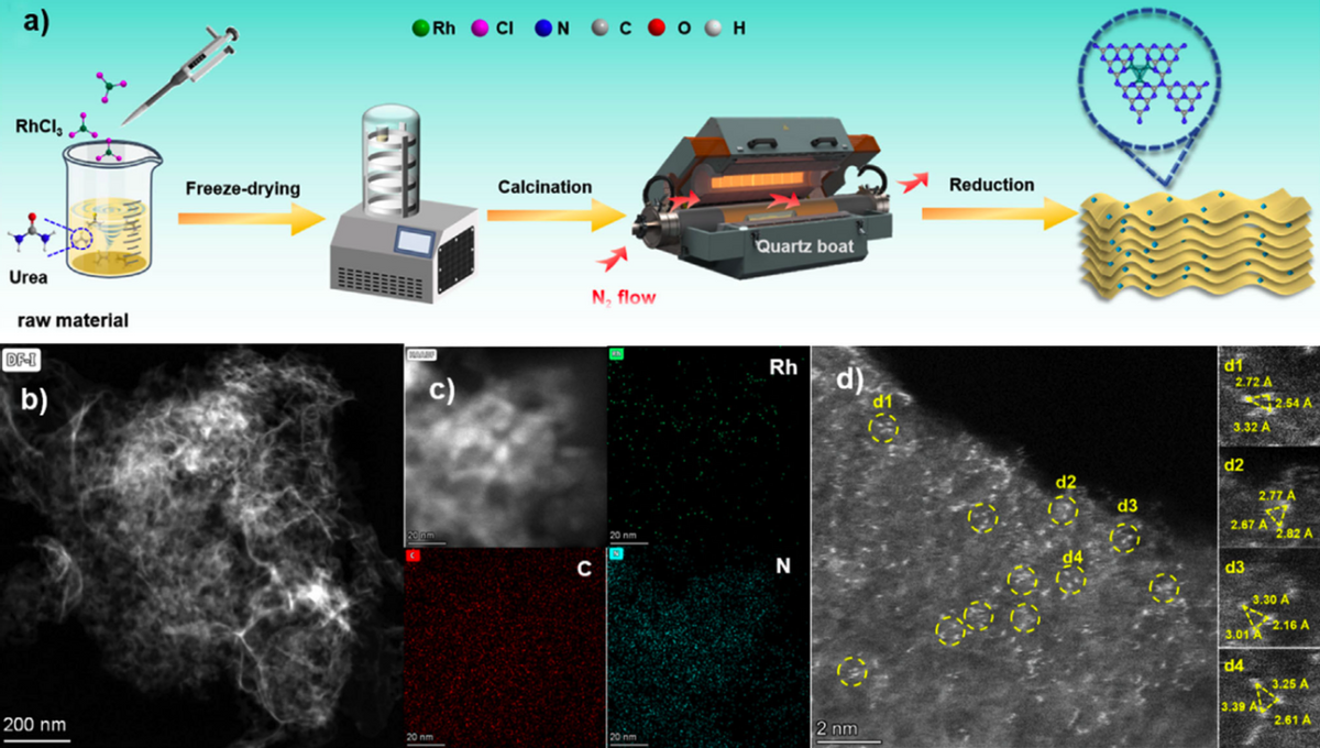 为了制备这种独特的单团簇催化剂,研究团队采用了“冷冻干燥-热聚合”的策略。他们首先将铑前驱体与尿素混合,通过冷冻干燥处理抑制铑离子的迁移,促进其与尿素基团的自组装。随后在氮气氛围下进行热处理,最后在氢气中还原,得到了铑单团簇负载在氮化碳载体上的催化剂。通过精密的X射线吸收光谱分析,他们确认催化剂中铑的平均配位数为2.06,这意味着每个铑团簇平均由约4个铑原子组成,实现了理想的单团簇结构。