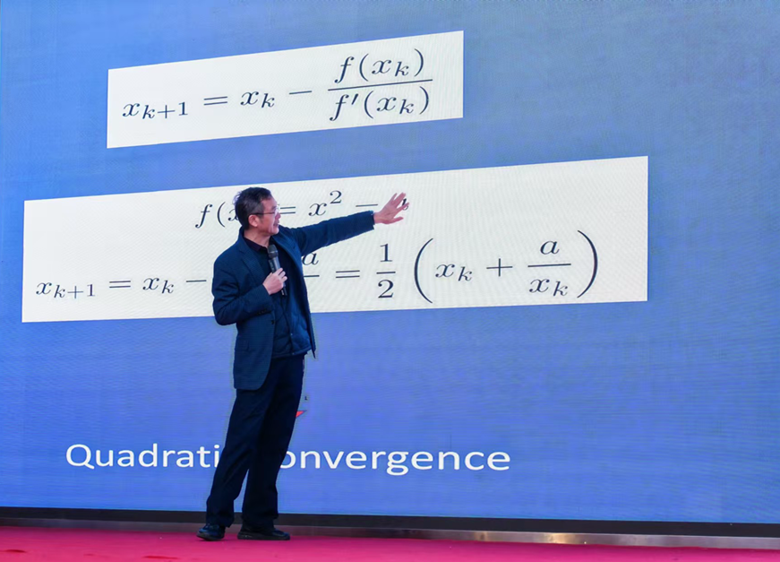袁亚湘院士还重点解读了十余种经典计算方法,从简化1到100求和的速算技巧,到牛顿方法、高斯消去法等专业算法,他以通俗语言拆解核心逻辑,如将共轭梯度法比作“结合过往路线爬山”,把随机梯度法类比“随机抽样了解学生情况”,让教师们轻松理解复杂原理。同时提及我国古代数学家刘徽对高斯消去法的早期探索、冯康先生奠定有限元方法基础等内容,彰显中国数学对计算领域的贡献。他强调,计算方法效率与计算工具性能同等重要,高效算法对解决问题的价值不亚于高速计算设备。他鼓励教师们关注计算科学发展,未来可引导学生感受计算魅力,培养观察思考能力。展望未来,袁亚湘院士表示,随着定量化研究普及,计算在跨学科融合、量子计算等领域的作用将愈发凸显。